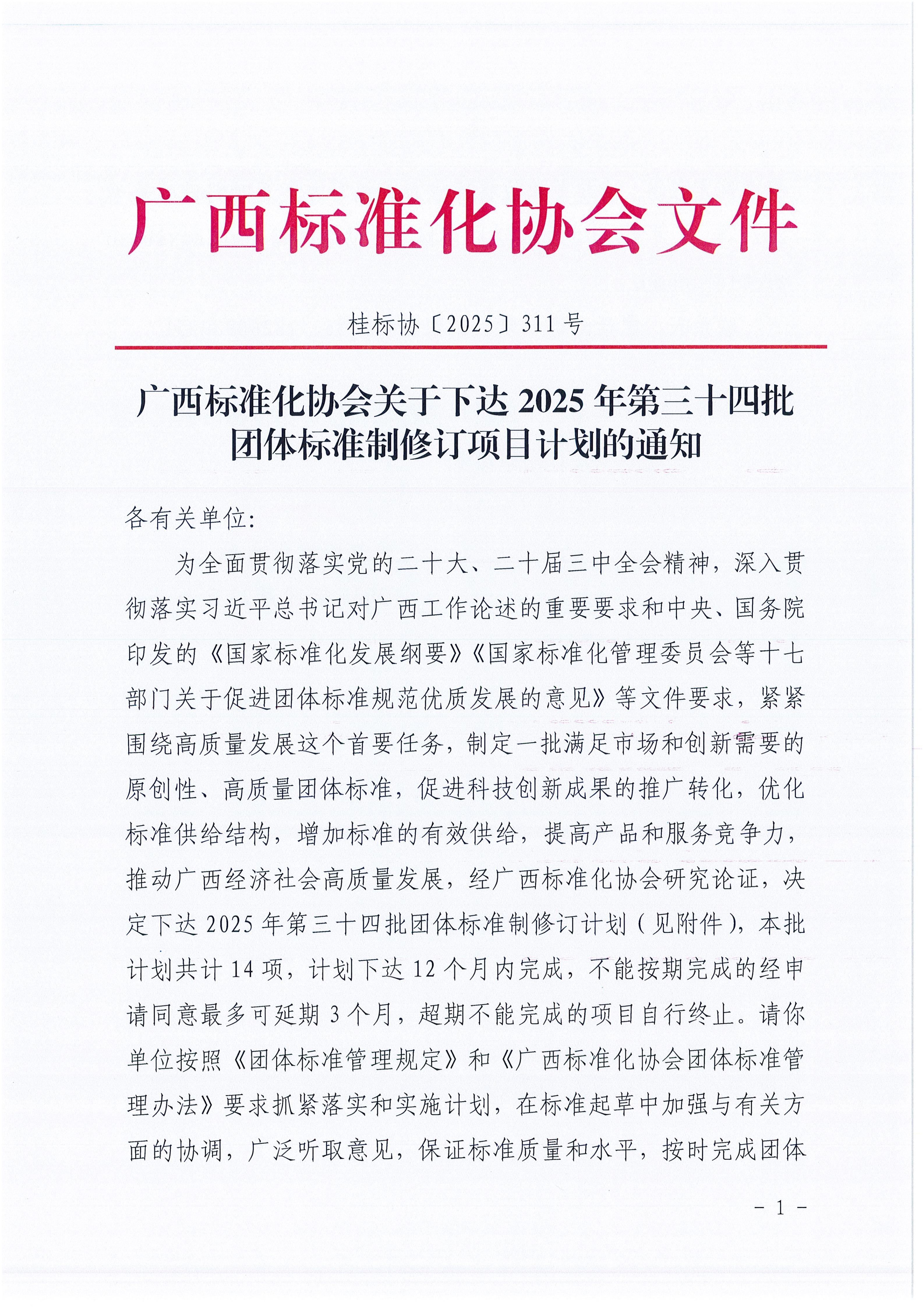 广西标准化协会关于下达2025年第三十四批团体标准制修订项目计划的通知