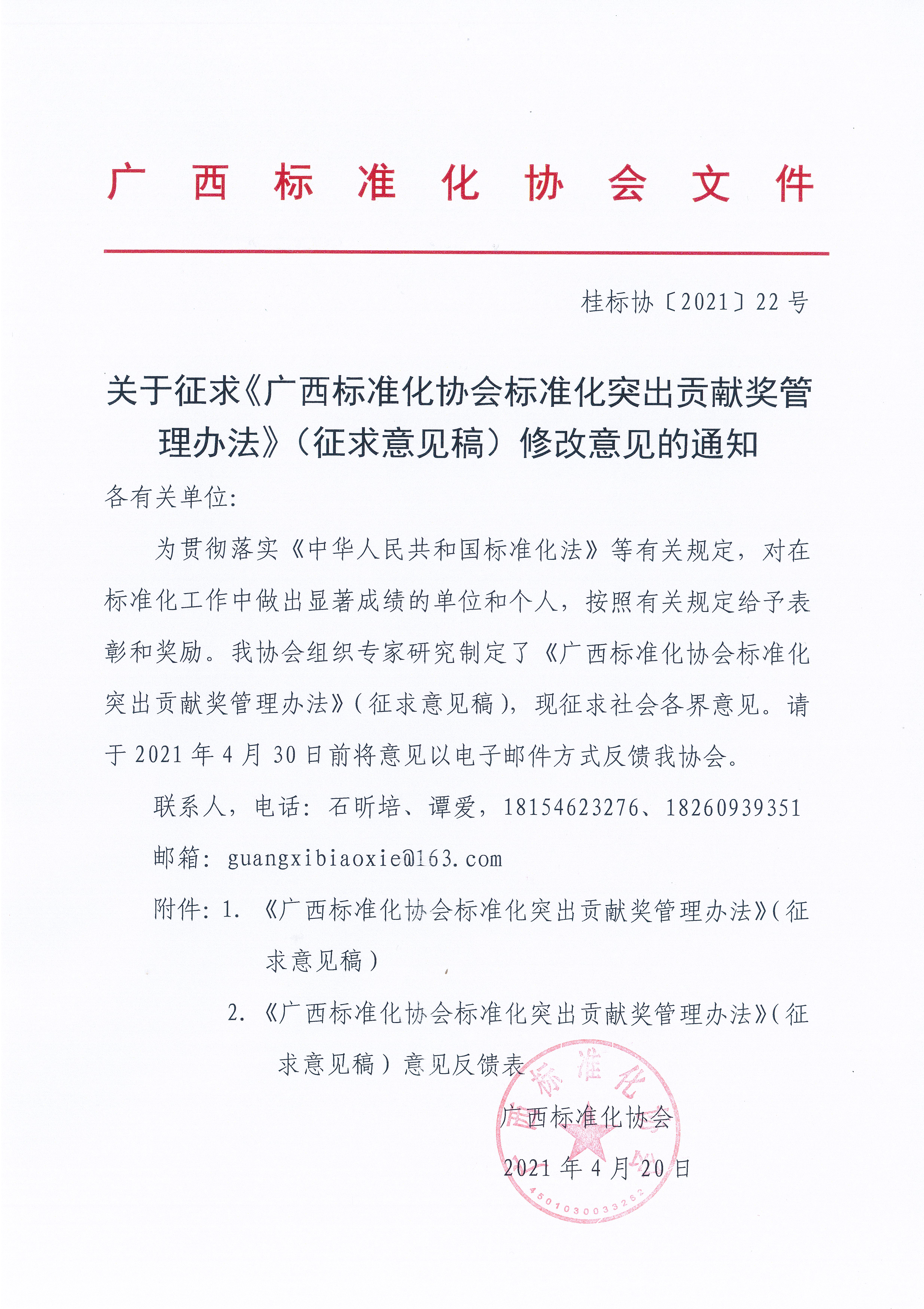 关于征求《广西标准化协会标准化突出贡献奖管理办法》(征求意见稿)修改意见的通知