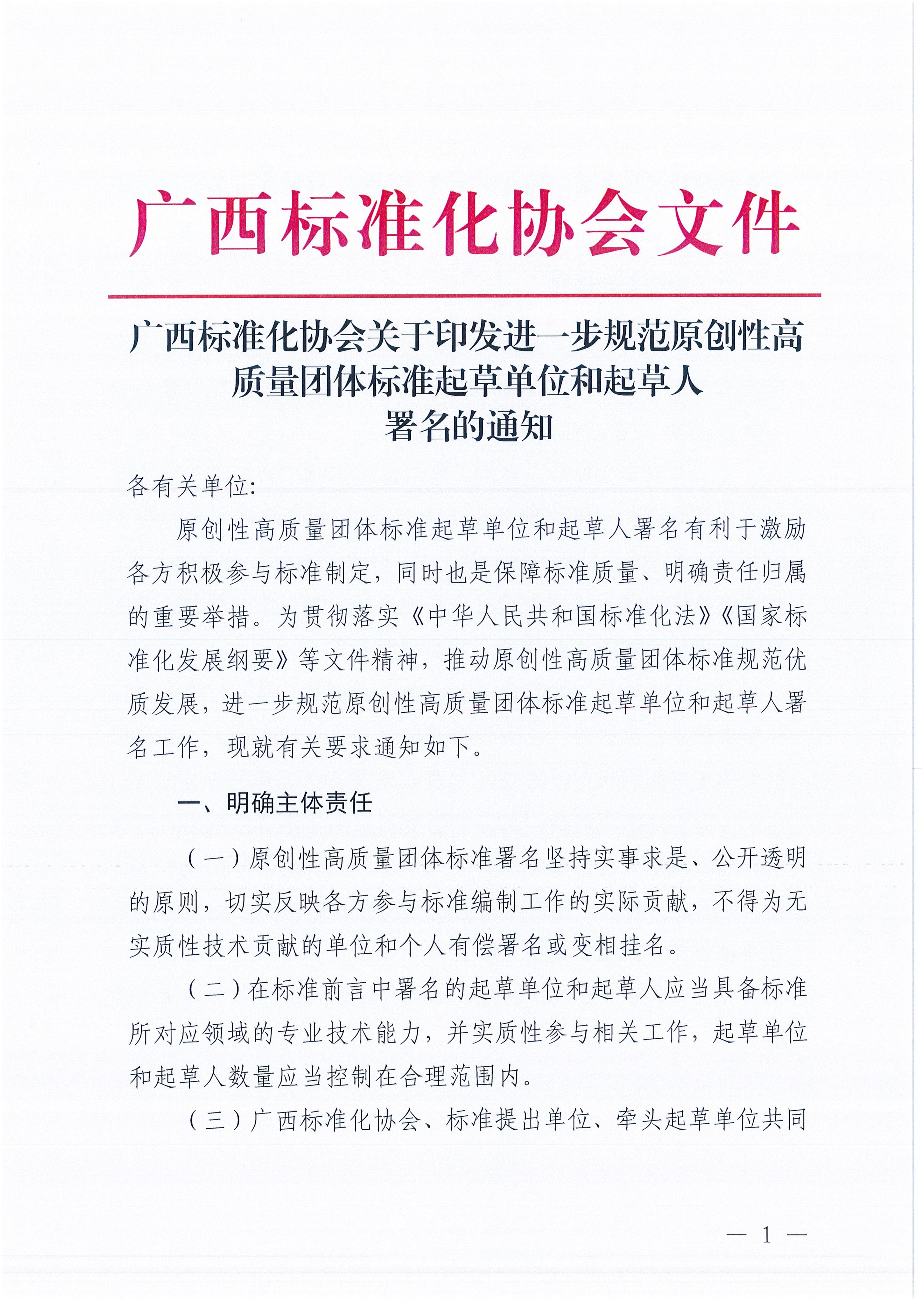 广西标准化协会关于印发进一步规范原创性高质量团体标准起草单位和起草人署名的通知