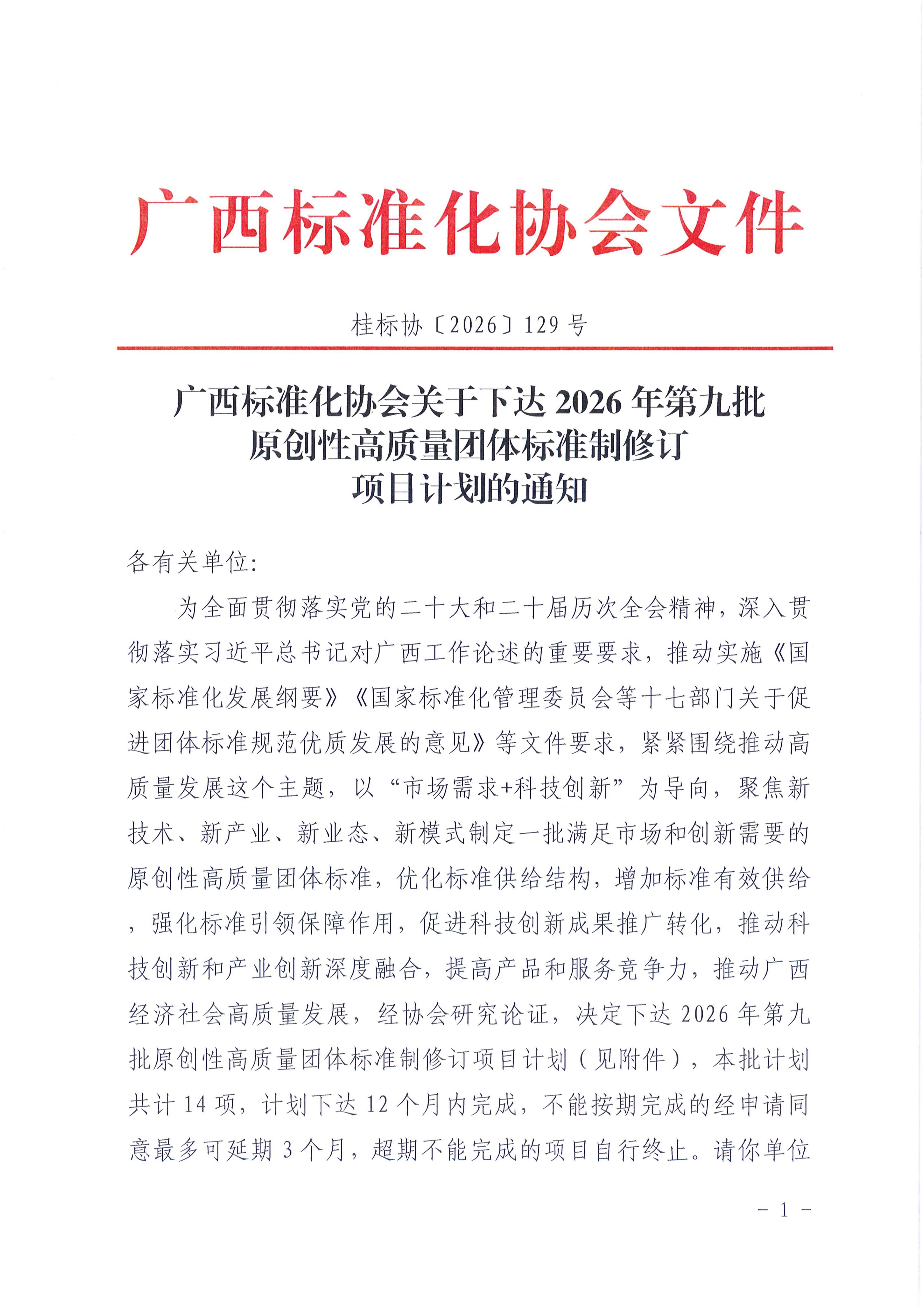 广西标准化协会关于下达2026年第九批团体标准制修订项目计划的通知