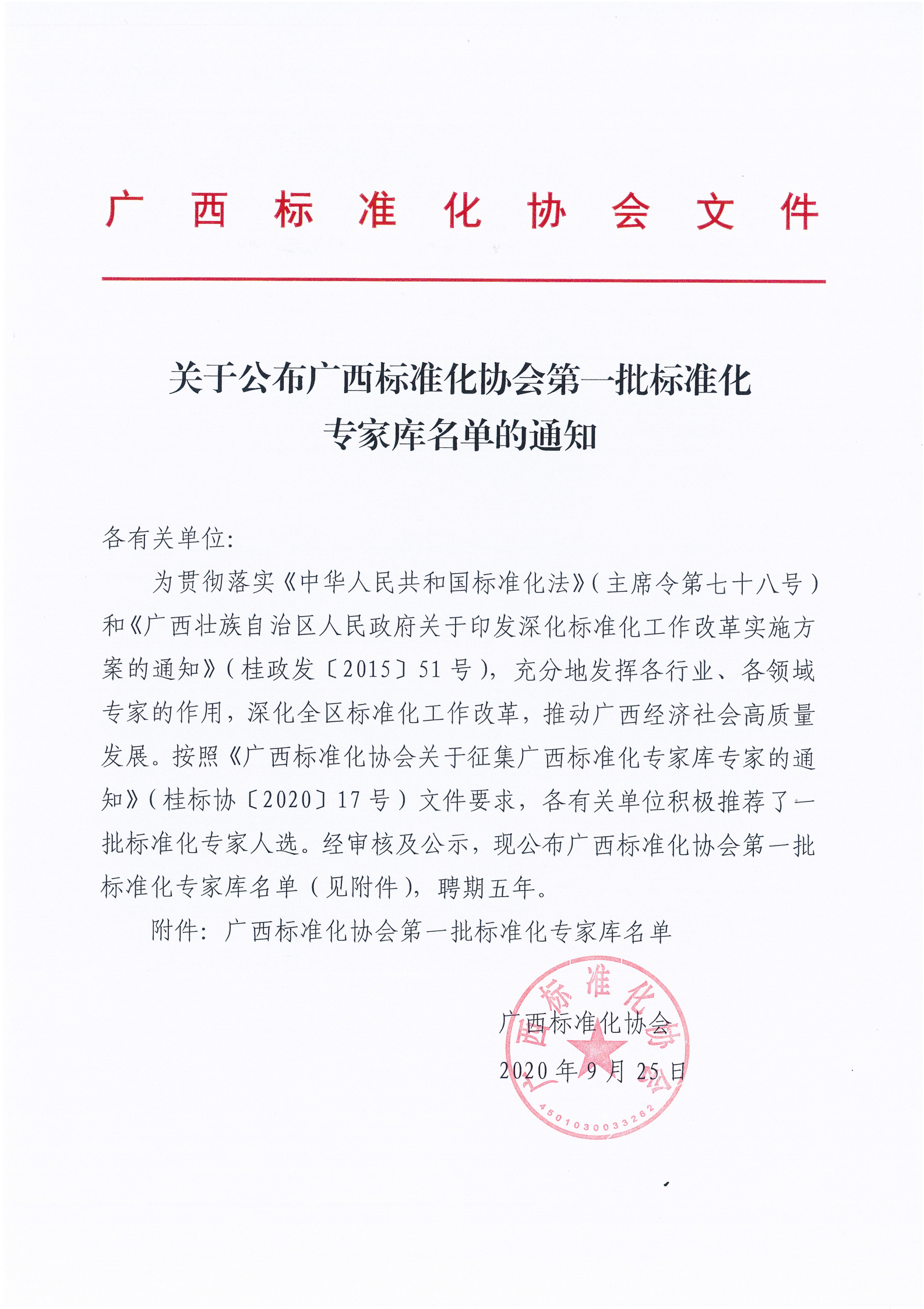 关于公布广西标准化协会第一批标准化专家库名单的通知