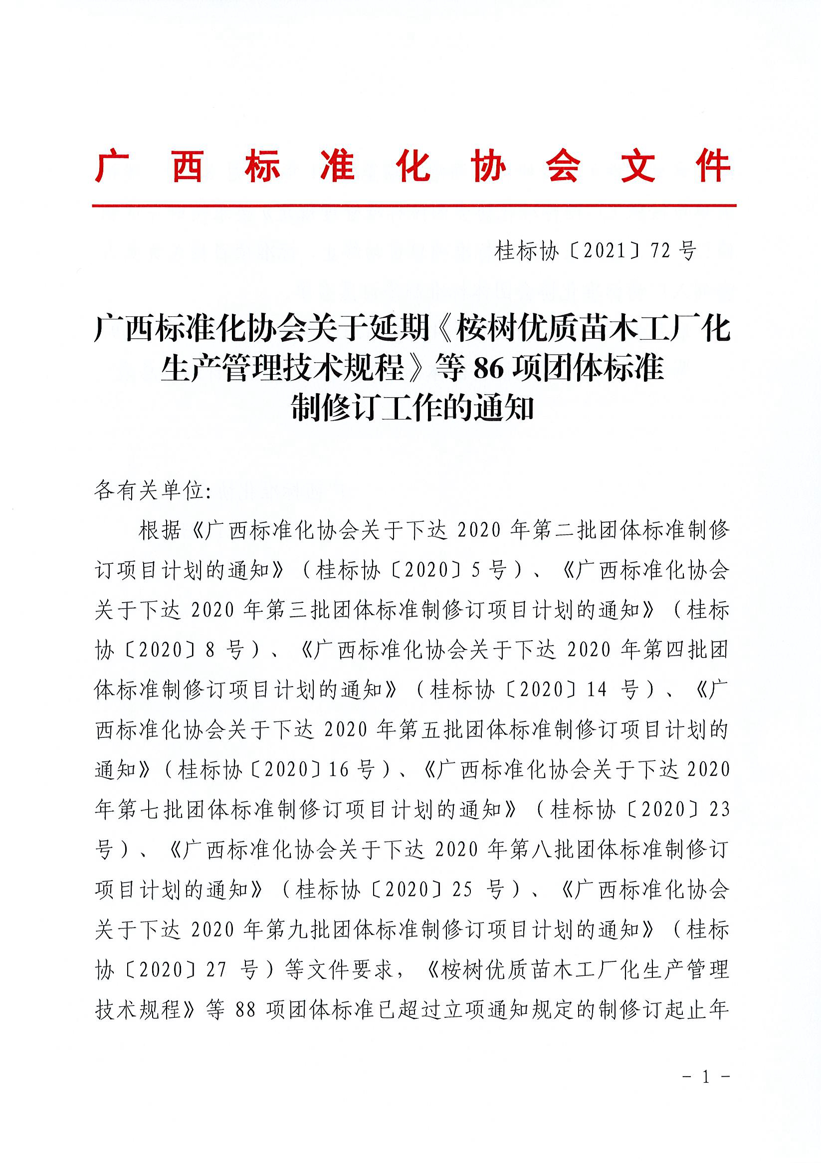 广西标准化协会关于延期《桉树优质苗木工厂化生产管理技术规程》等86项团体标准制修订的通知