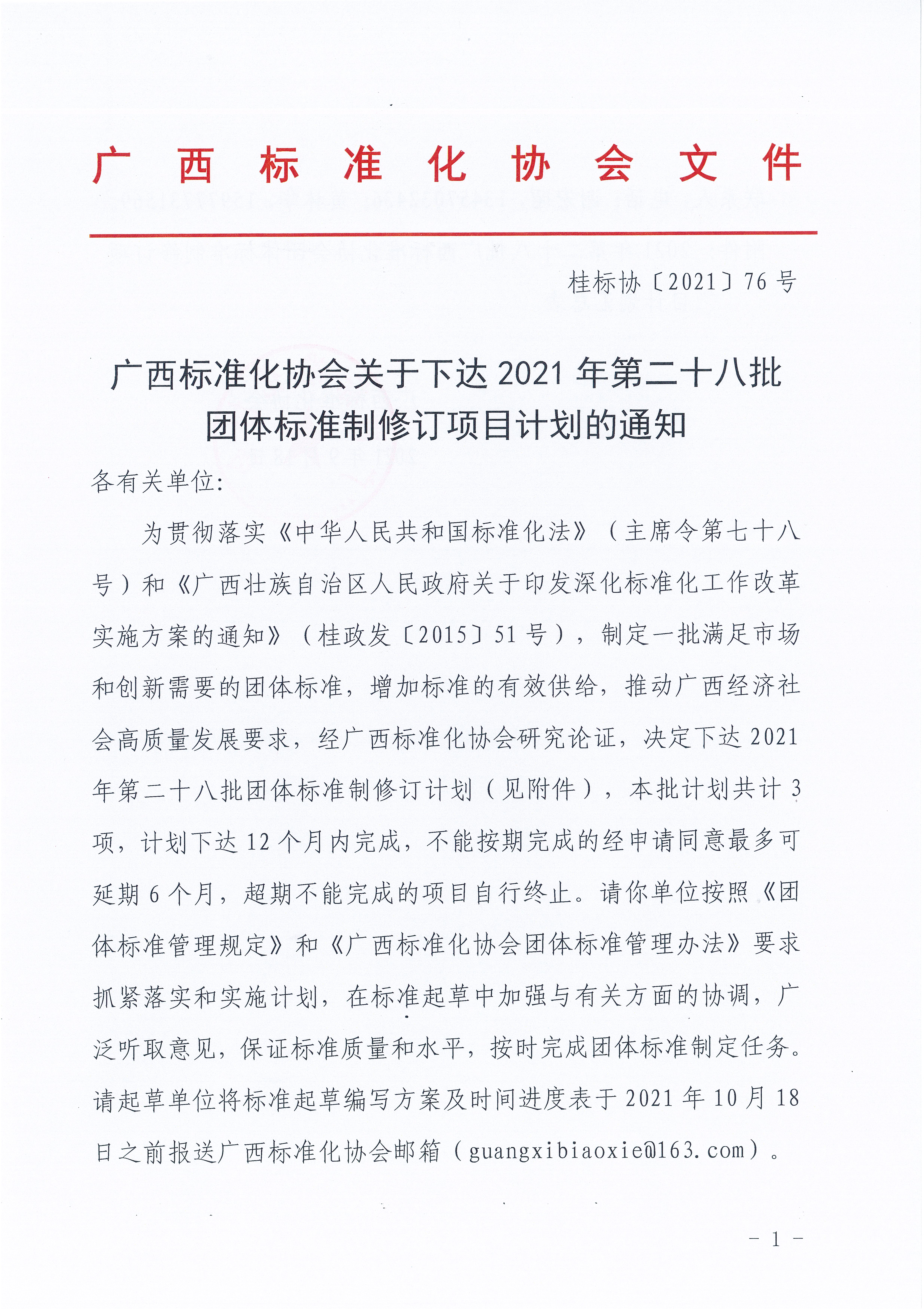 广西标准化协会关于下达2021年第二十八批团体标准制修订项目计划的通知