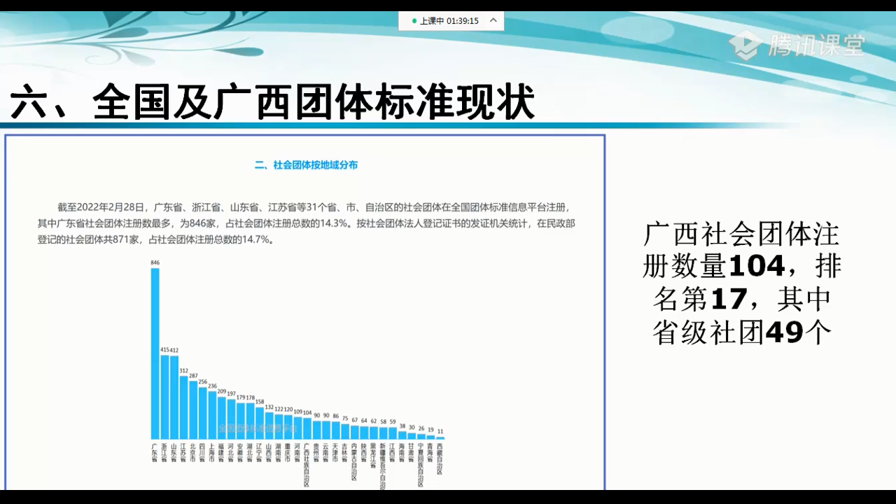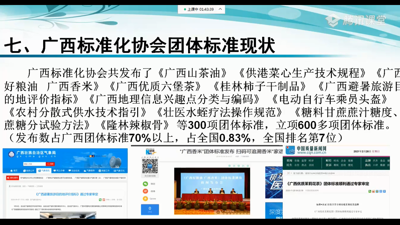 本次线上免费公益讲座报名火爆,从印发培训通知到举行培训仅仅一个星期,就有700多人报名,包括广西标准化协会会员、广西标准化协会标准化专家库专家、各设区市市场监管局标准化相关人员、县(市、区)市场监管局标准化相关人员及其他相关标准化工作人员。据统计,500多人在腾讯课堂在线听课,同时梧州市产品质量检验所、广西勘察设计协会、广西区直国有林场林下经济绿色产业联合会等单位还组织员工集体观看培训讲座。