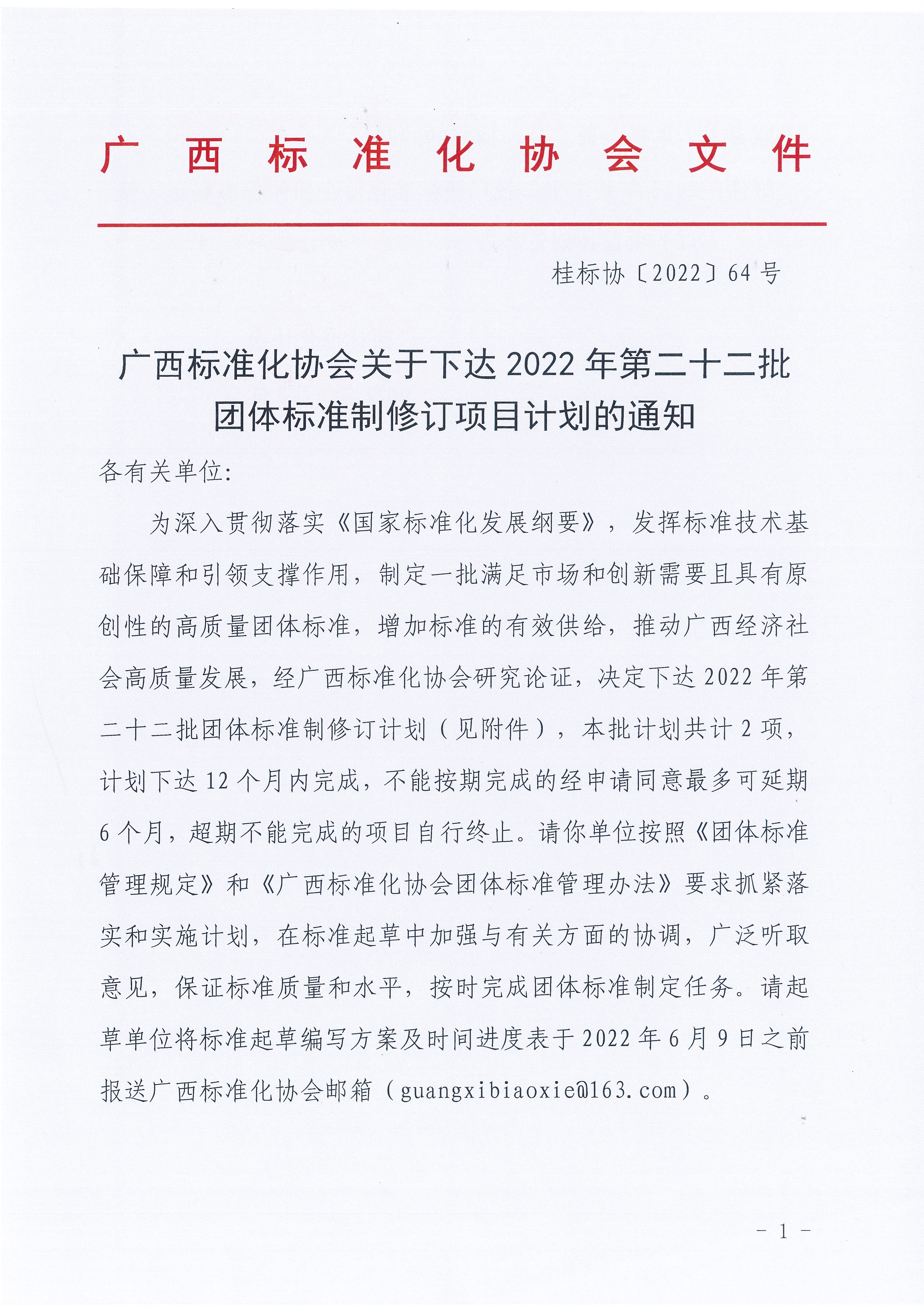 广西标准化协会关于下达2022年第二十二批团体标准制修订项目计划的通知