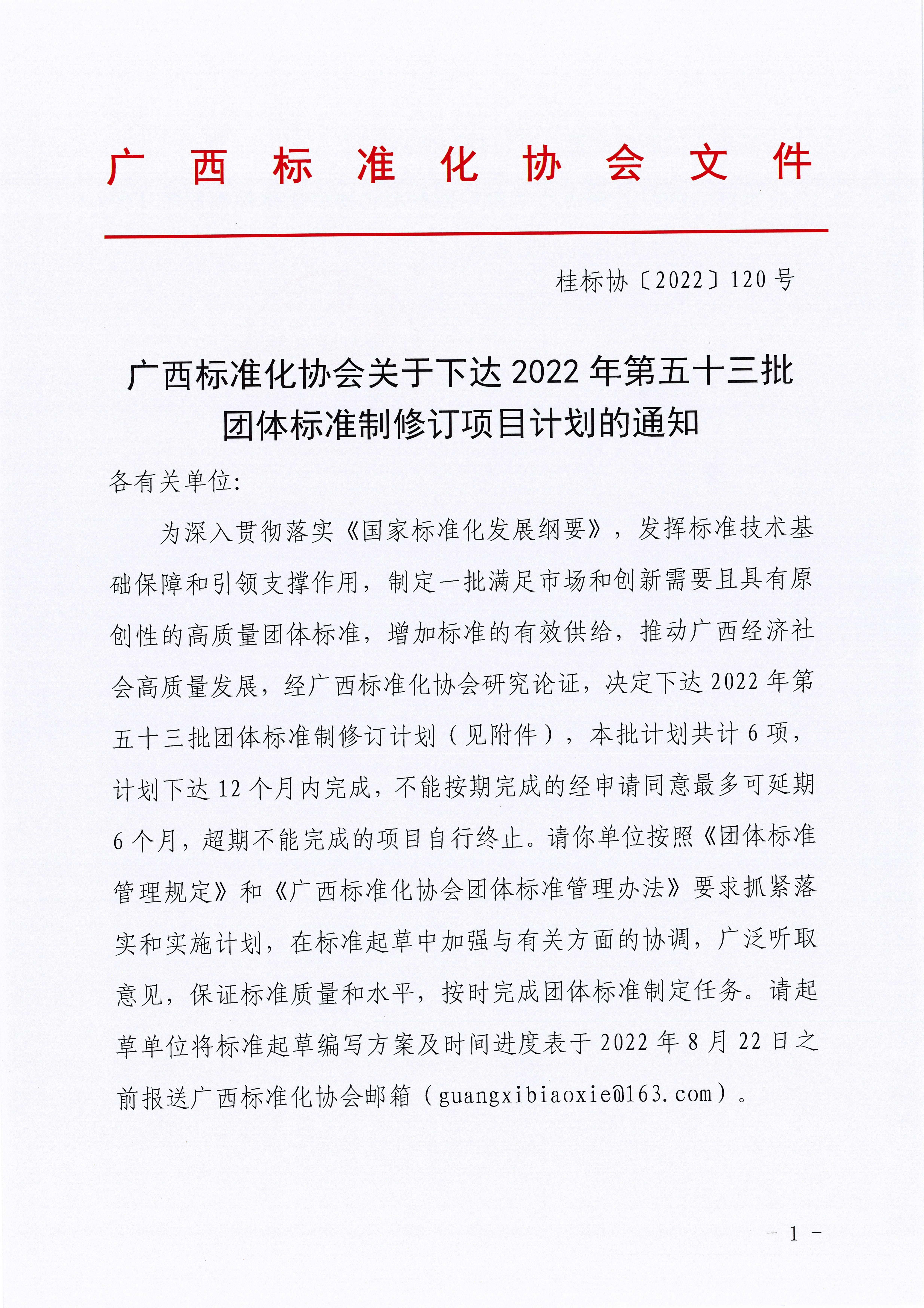 广西标准化协会关于下达2022年第五十三批团体标准制修订项目计划的通知