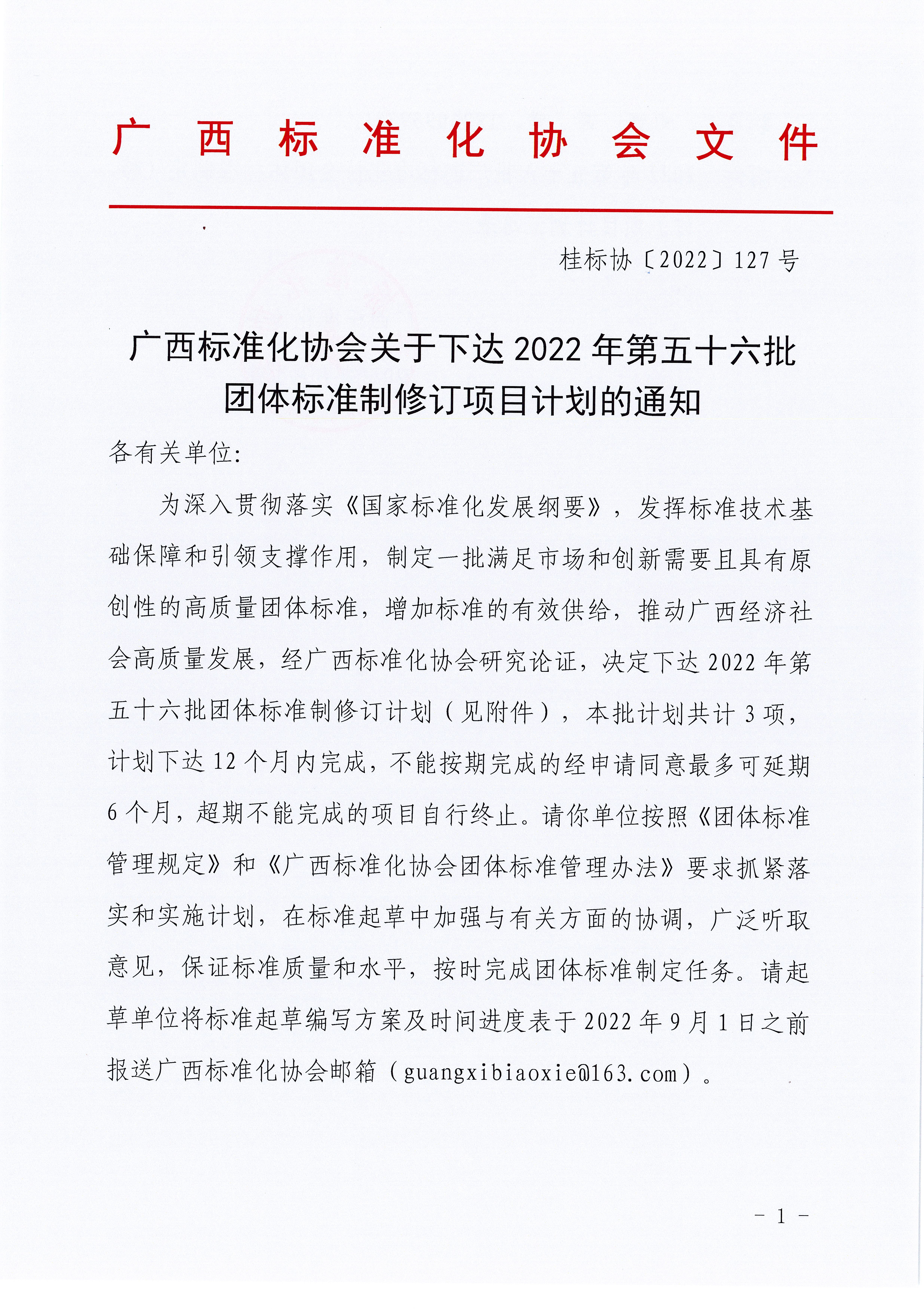 广西标准化协会关于下达2022年第五十六批团体标准制修订项目计划的通知