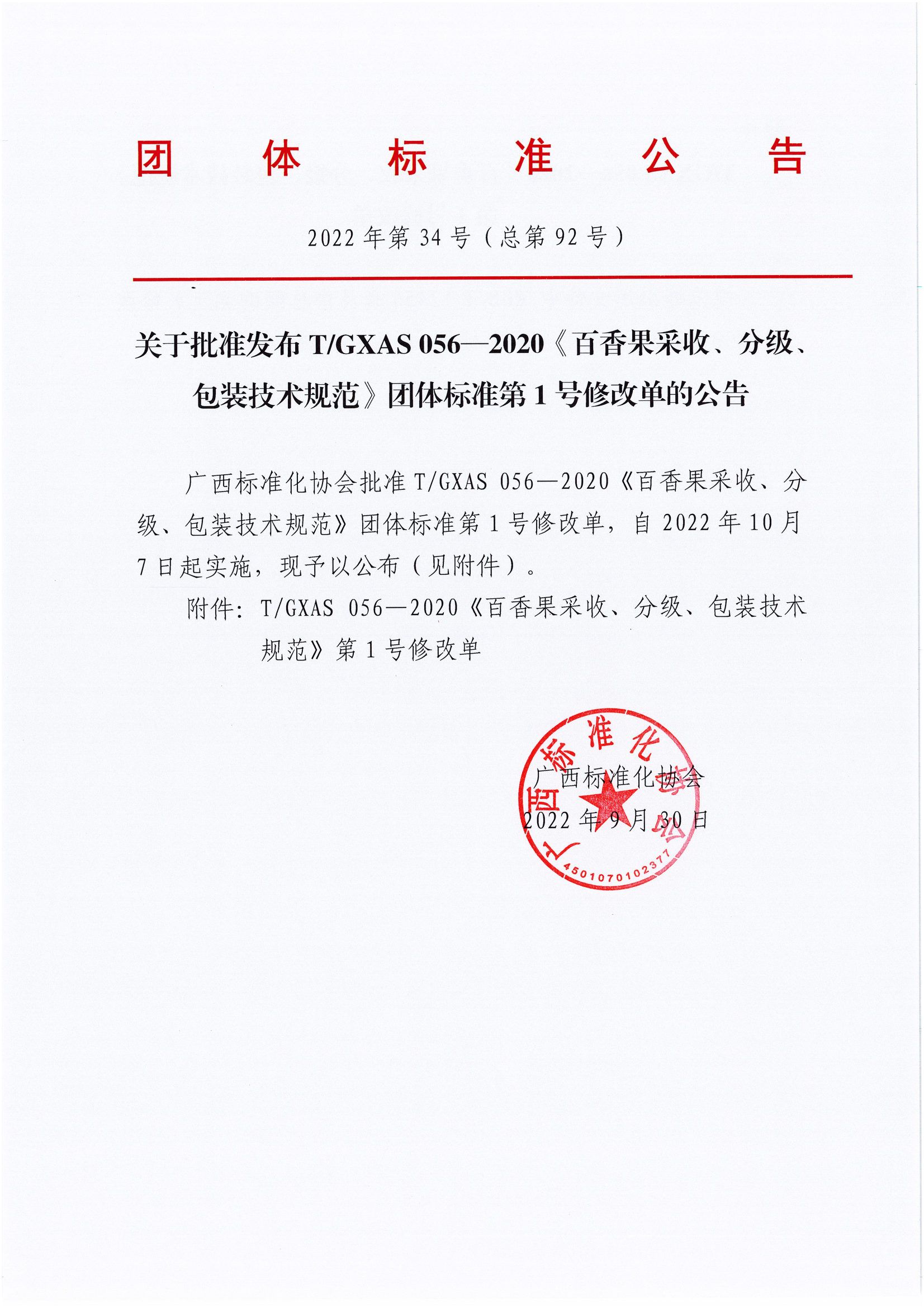 关于批准发布TGXAS 056—2020《百香果采收、分级、包装技术规范》团体标准第1号修改单的公告
