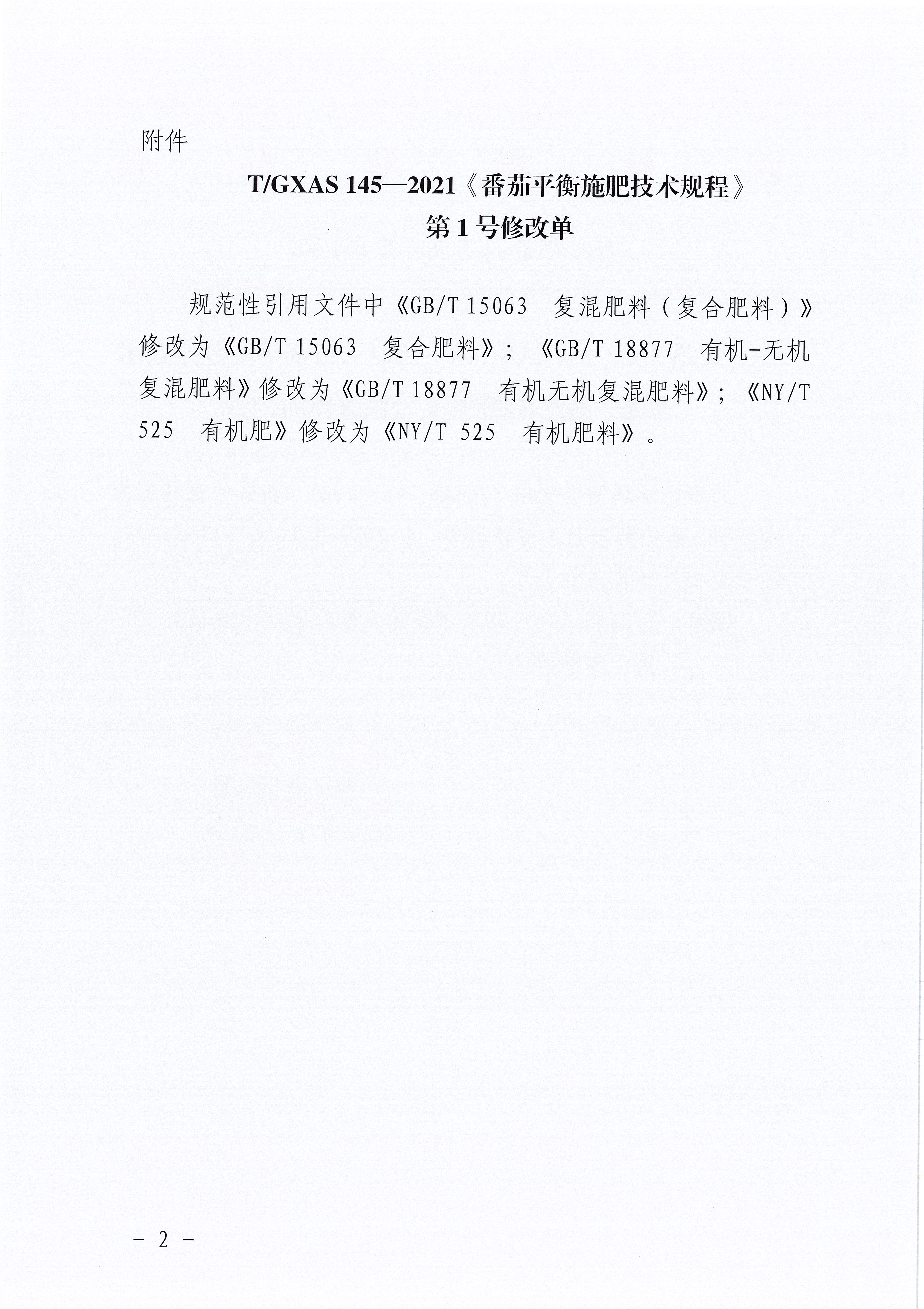 关于批准发布TGXAS 145—2021《番茄平衡施肥技术规程》团体标准第1号修改单的公告