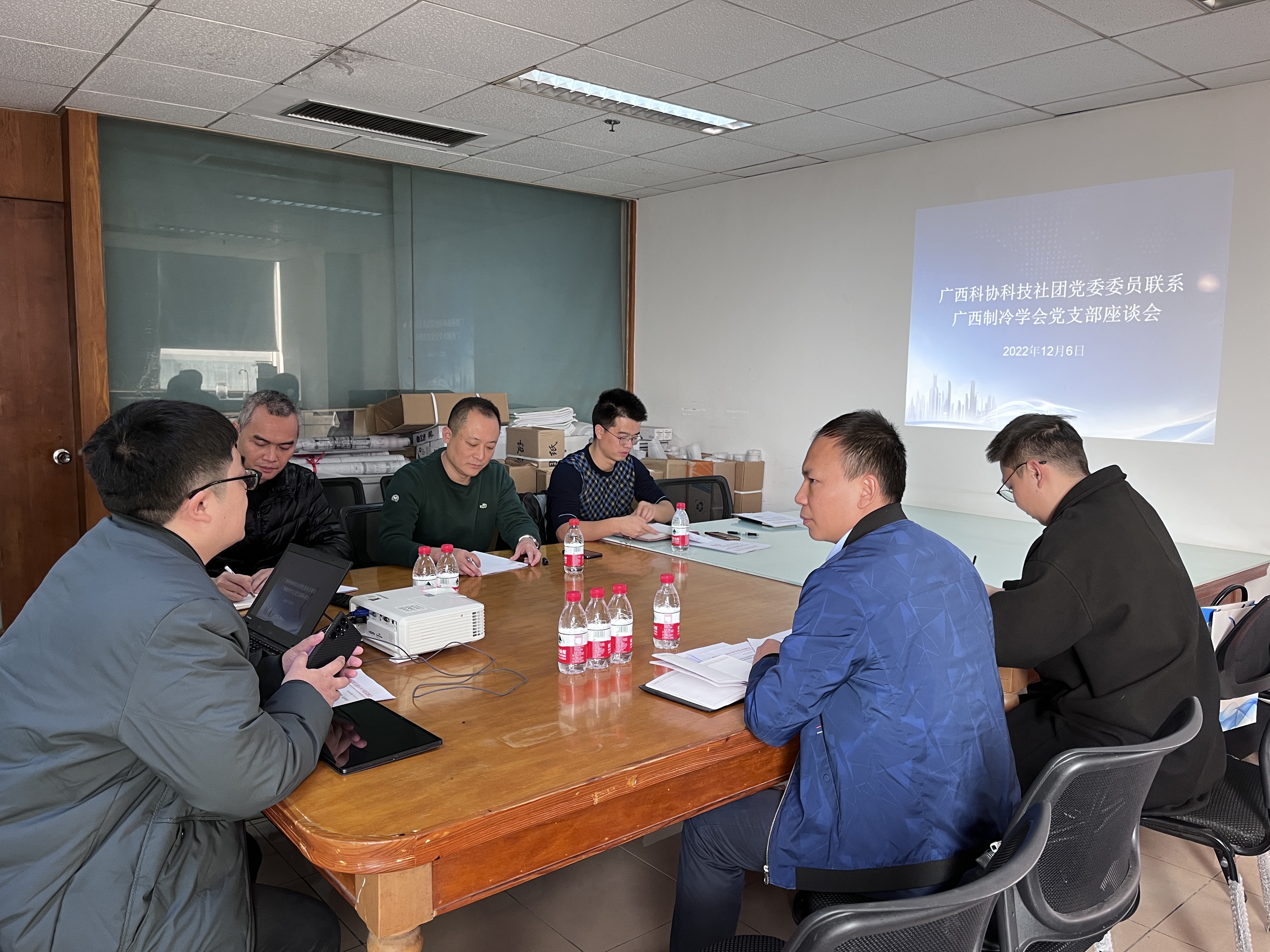 2022年12月6日,为进一步贯彻落实中央关于党要管党、从严治党的重大部署,增强广西科协科技社团党委与广西制冷学会党支部的沟通,密切联系广西制冷学会,听取党员意见,进一步推进广西制冷学会党支部标准化规范化建设,广西科协科技社团党委委员谢宏昭到广西制冷学会党支部实地走访调研座谈,广西制冷学会副理事长兼党支部书记刘国成、副理事长兼秘书长覃振东、常务副秘书长赵海涛、理事兼党支部宣传委员孙爱民、广西标准化协会党支部党建专员赵翊波一同参加调研座谈会。