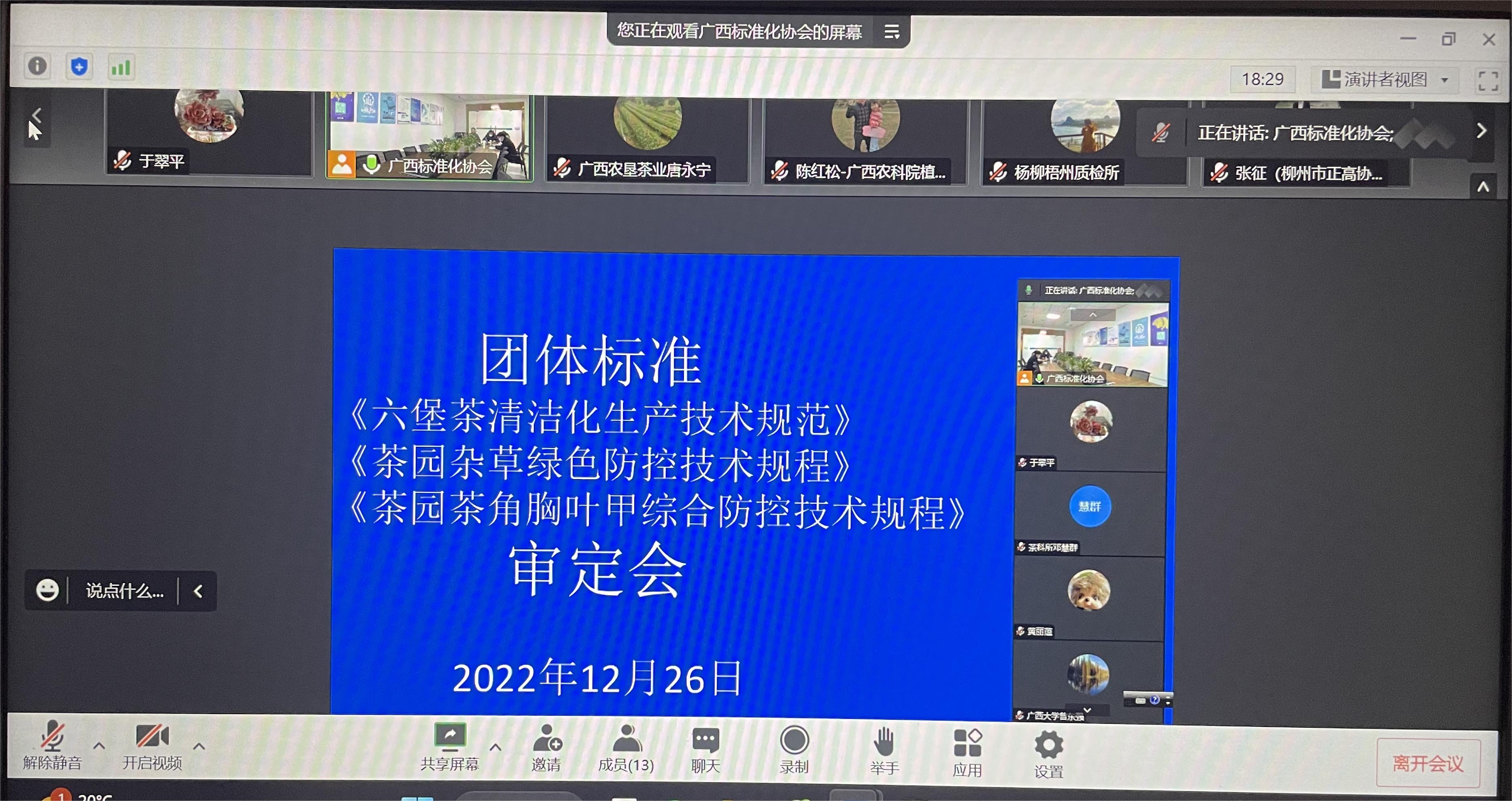 12月26日,广西标准化协会通过腾讯会议线上组织专家对由梧州市农业科学研究所、梧州市六堡茶研究院、广西农业科学院梧州分院梧州市茶产业发展服务中心、广西梧州茶厂有限公司、梧州中茶茶业有限公司、梧州市产品质量检验所[广西黑茶(六堡茶)产品质量监督检验中心]、苍梧县六堡茶产业发展中心等单位起草的团体标准《六堡茶清洁化生产技术规范》《茶园杂草绿色防控技术规程》《茶园茶角胸叶甲综合防控技术规程》进行了审定,专家一致同意通过审定。