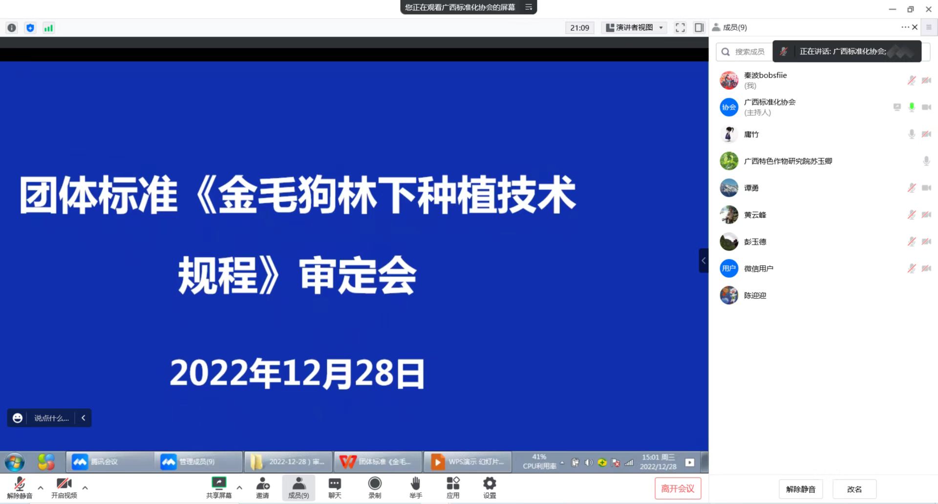 12月28日,广西标准化协会通过腾讯会议线上组织专家对由广西壮族自治区林业科学研究院提出,广西壮族自治区林业科学研究院、广西壮族自治区中医药研究院、广西明峰生物科技有限公司等单位共同起草团体标准《金毛狗林下种植技术规程》进行了审定。