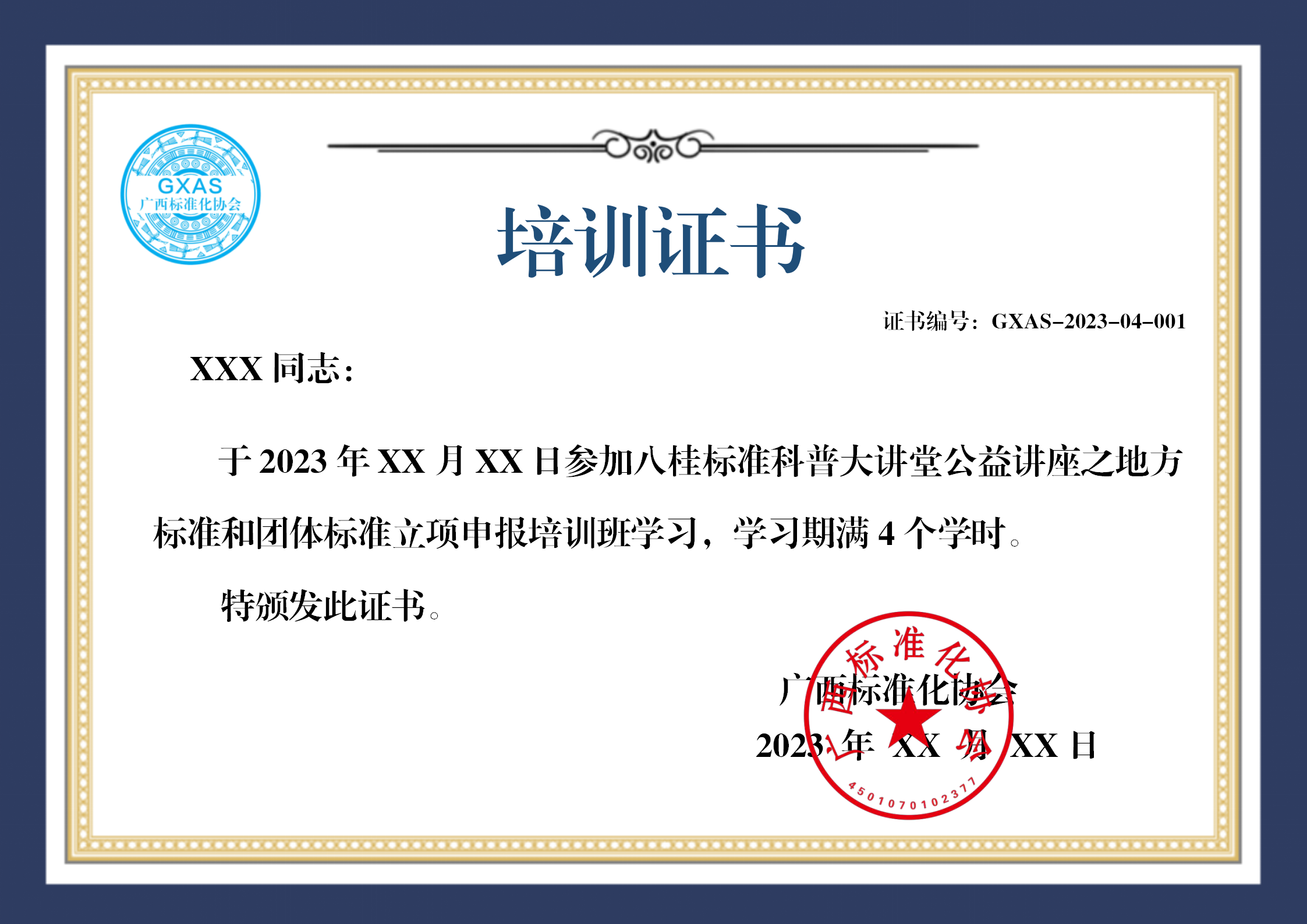 培训结束后颁发广西标准化协会统一印制的标准培训证书(电子版),可作为专业技术能力考核的依据。
