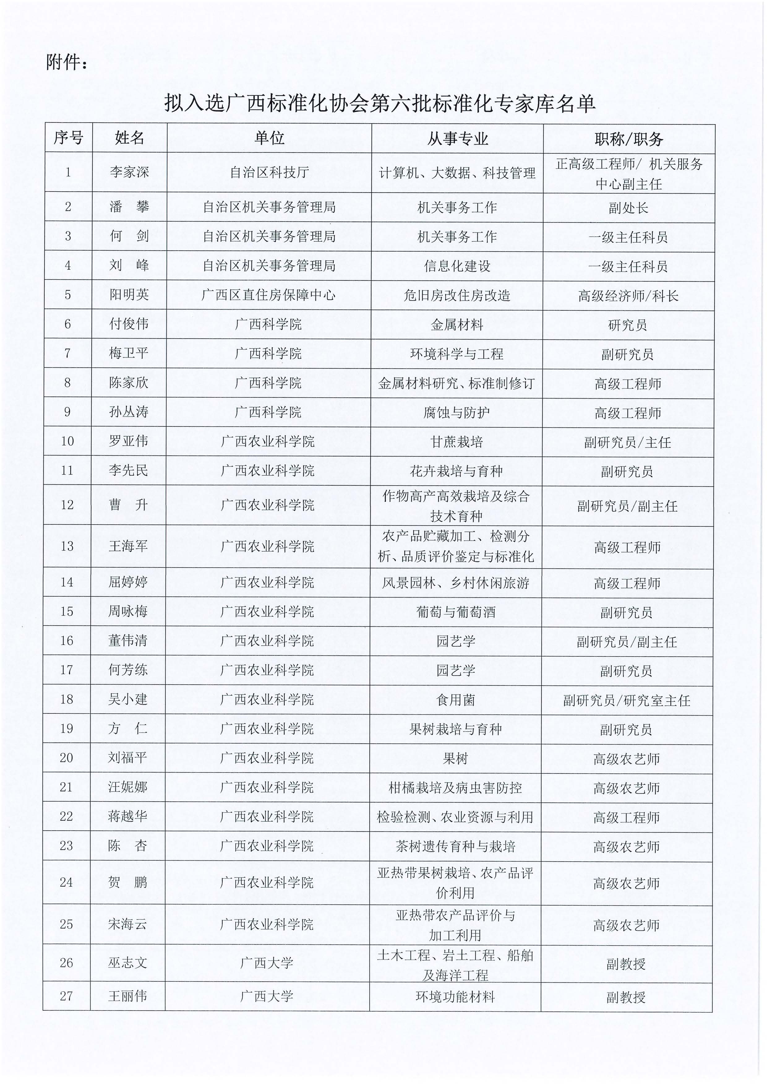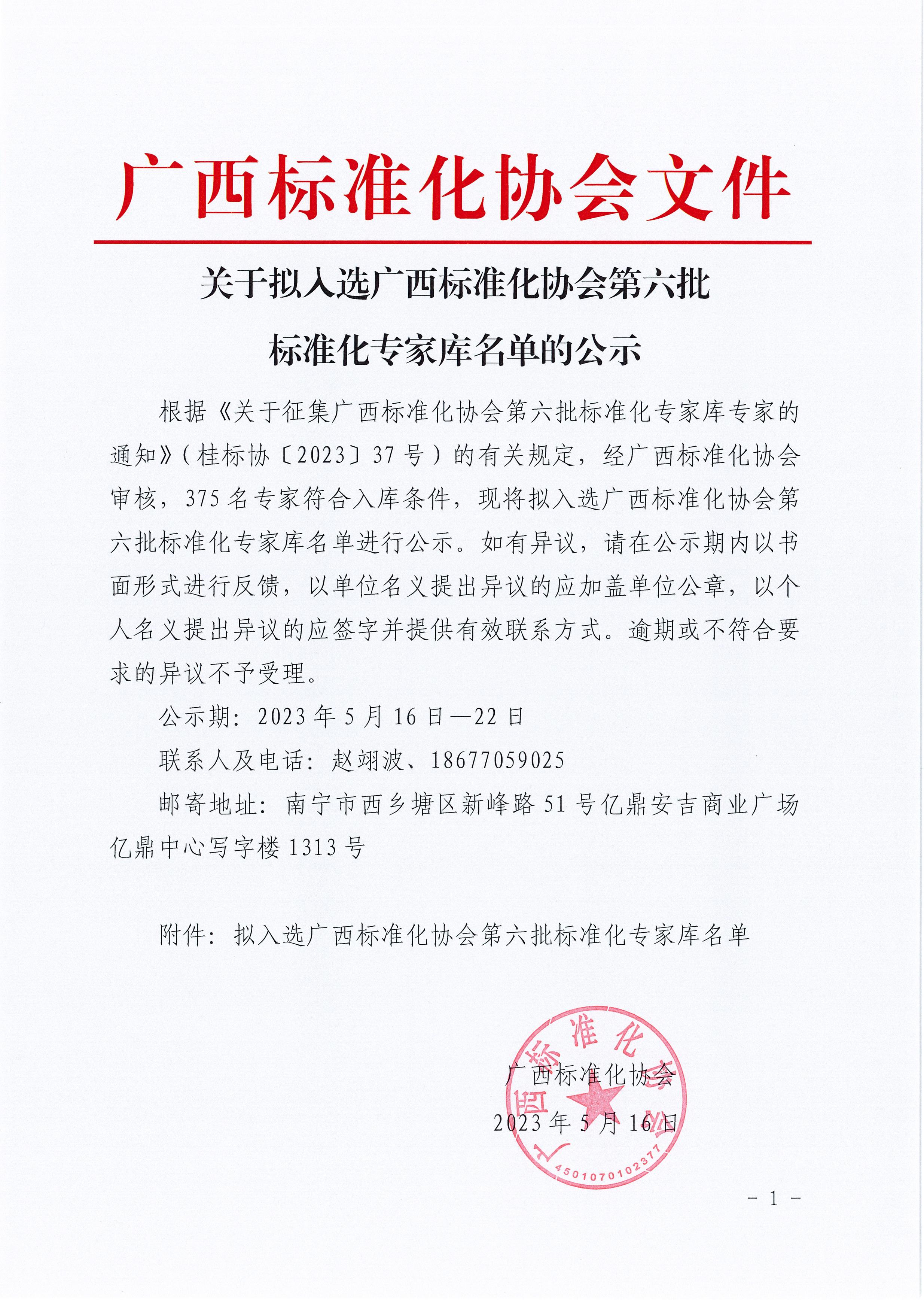 关于拟入选广西标准化协会第六批标准化专家库名单的公示