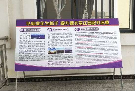 通过旅游景区服务标准体系的实施,对标《旅游景区服务指南》、《公共信息图形符号 第1部分:通用符号》等系列国家标准,忻城薰衣草庄园完善了景区导向系统,更换了不规范的标识标牌,取得了显著的效果,薰衣草庄园2019年游客满意度达到了97.4%。