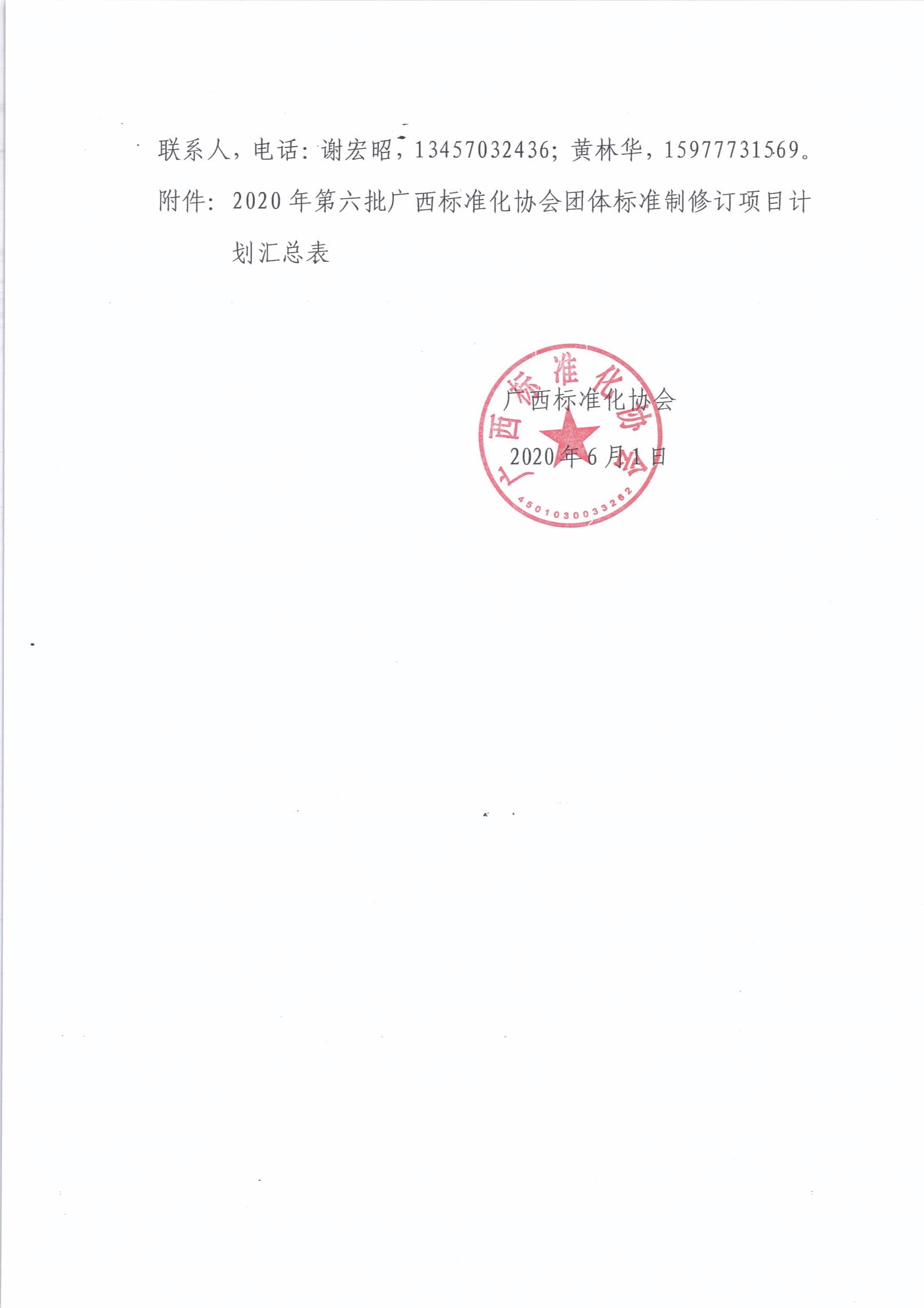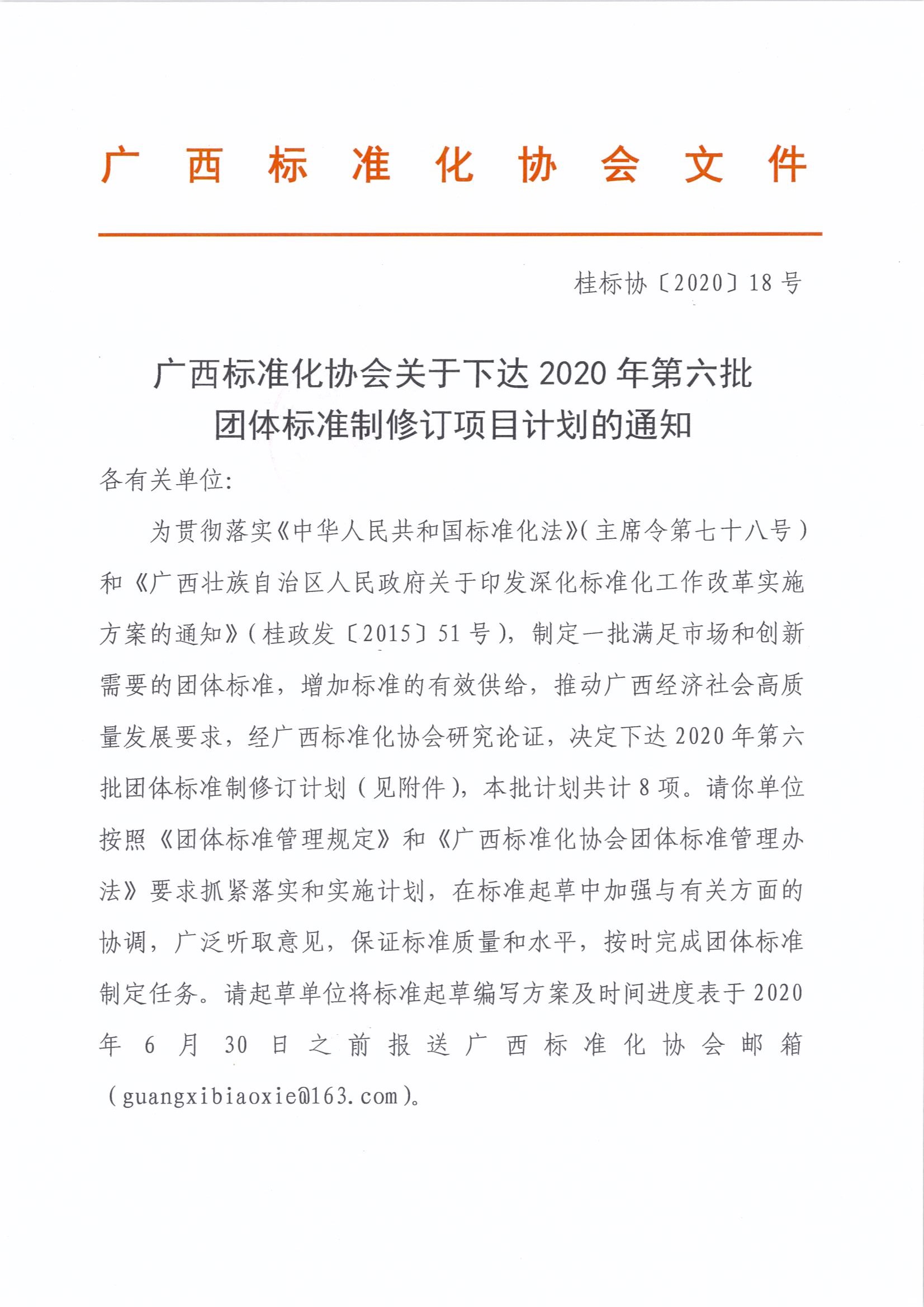 广西标准化协会关于下达2020年第六批团体标准制修订项目计划的通知