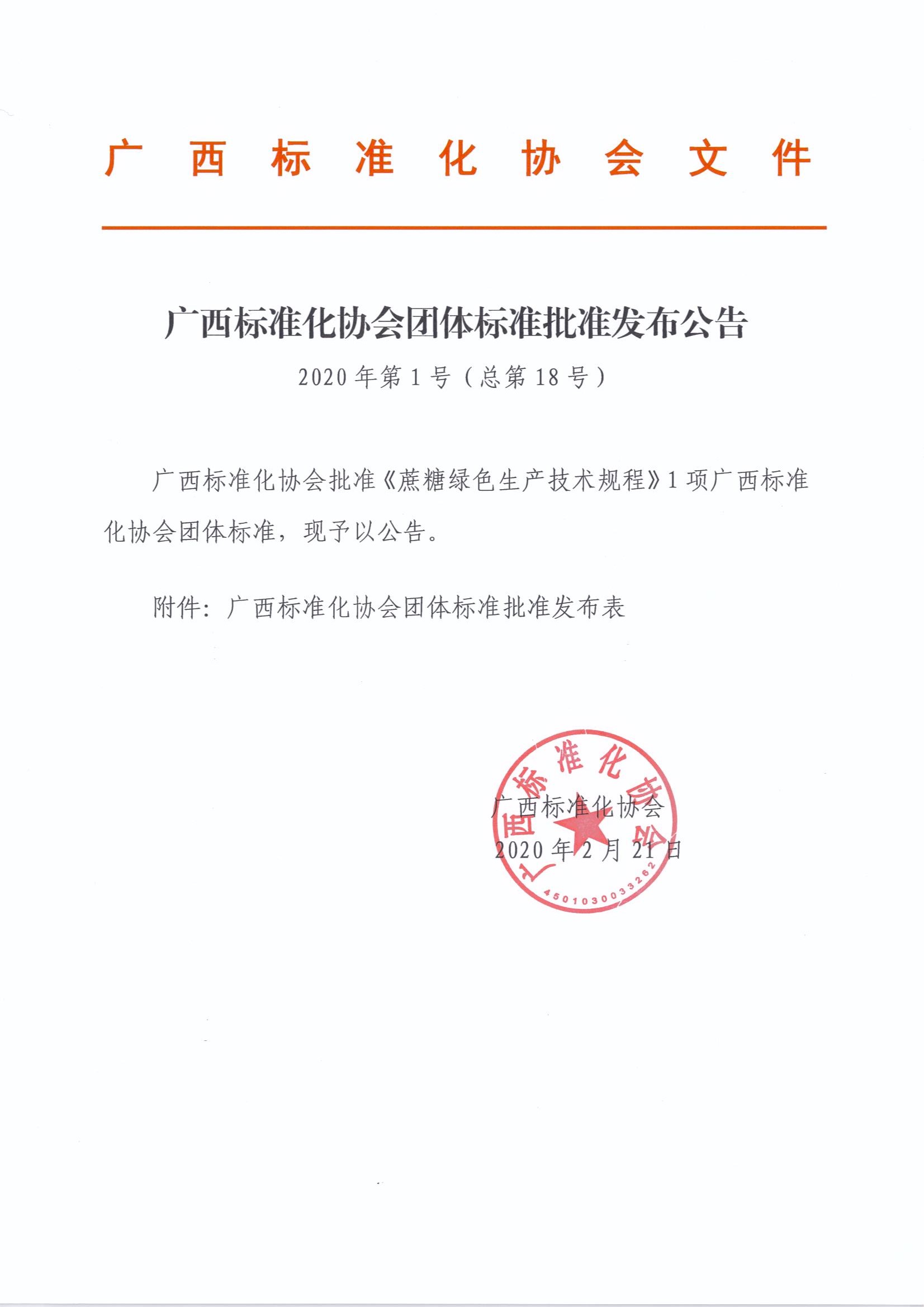 广西标准化协会团体标准批准发布公告《2020年第1号(总第18号)》