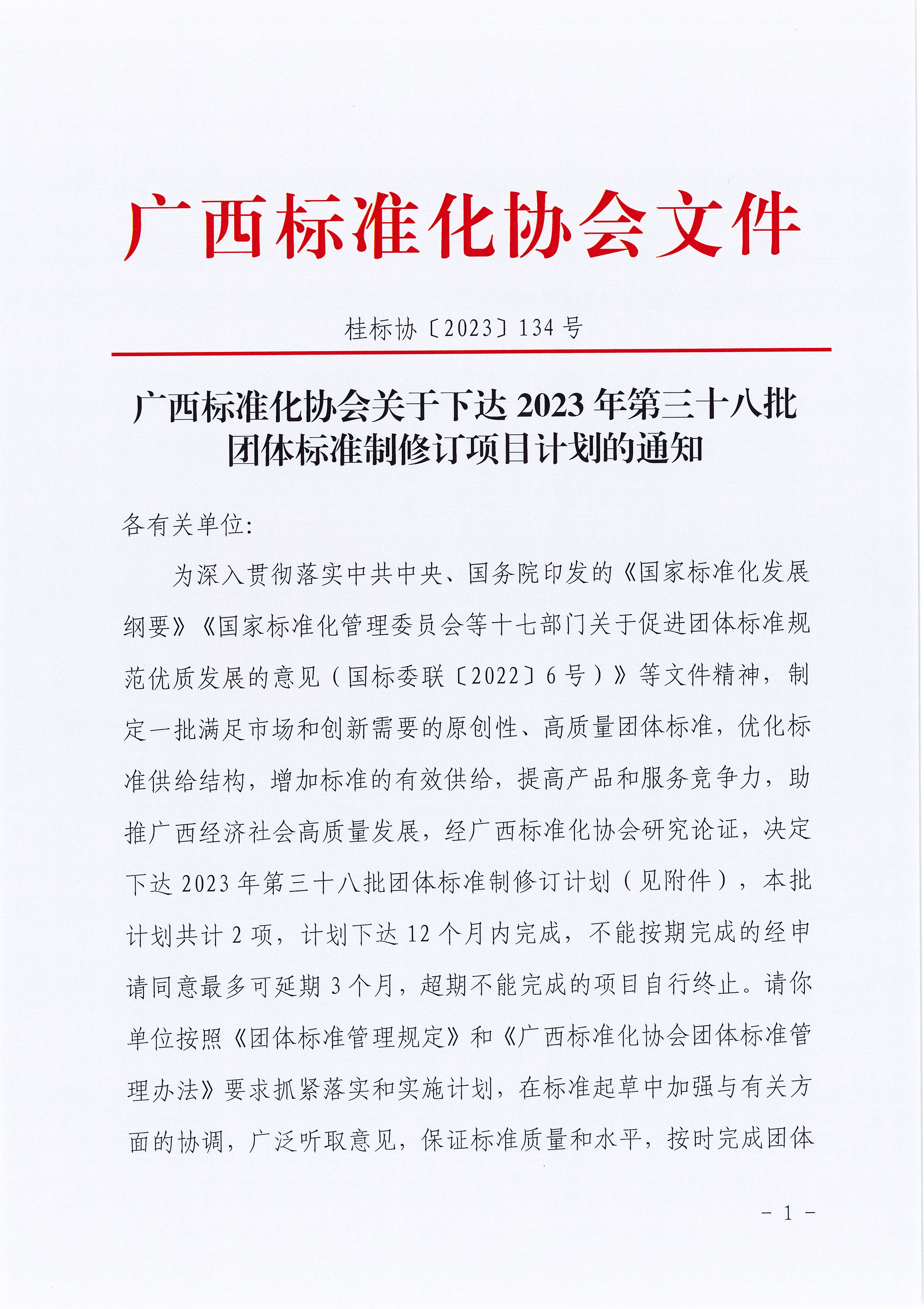 广西标准化协会关于下达2023年第三十八批团体标准制修订项目计划的通知