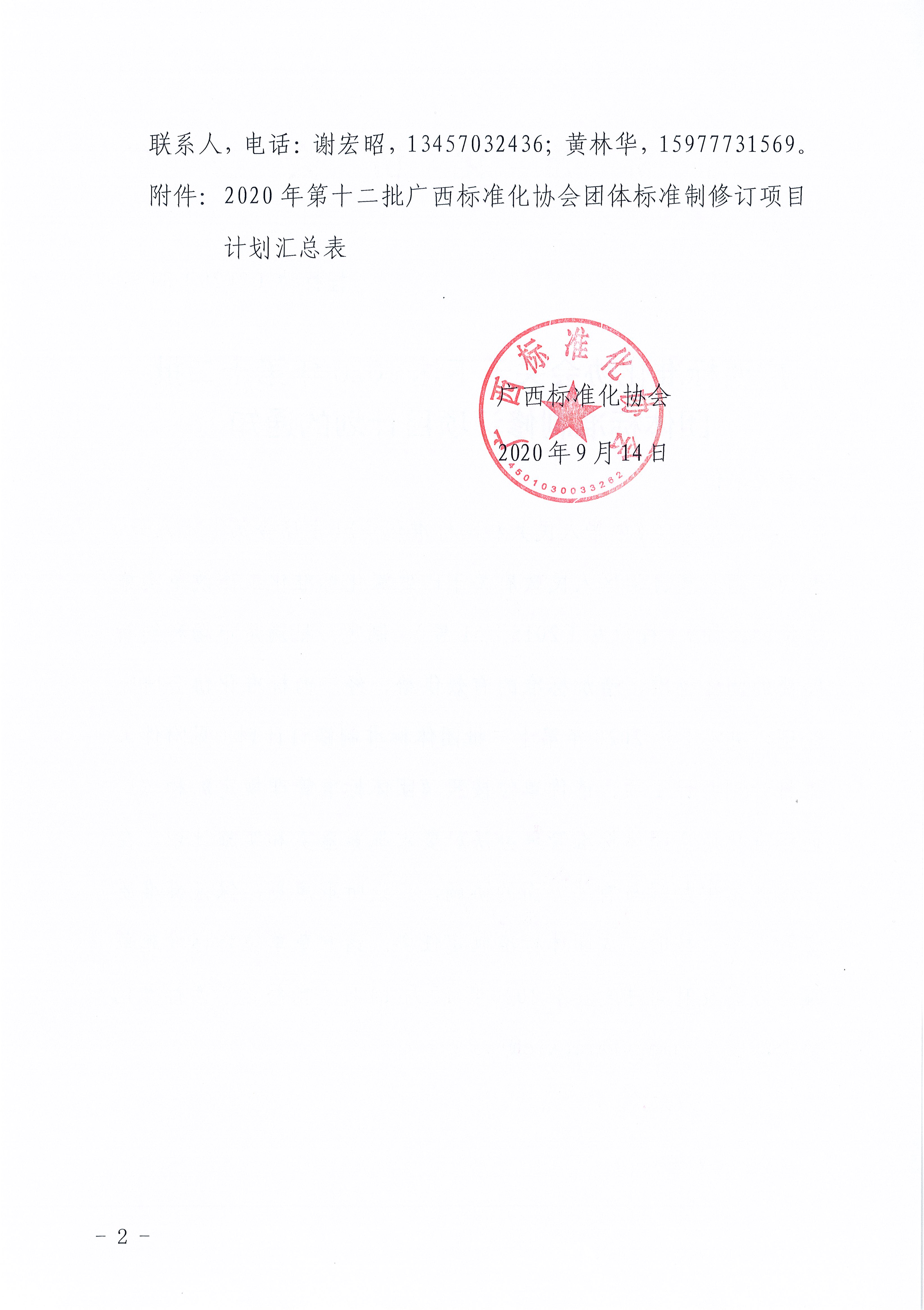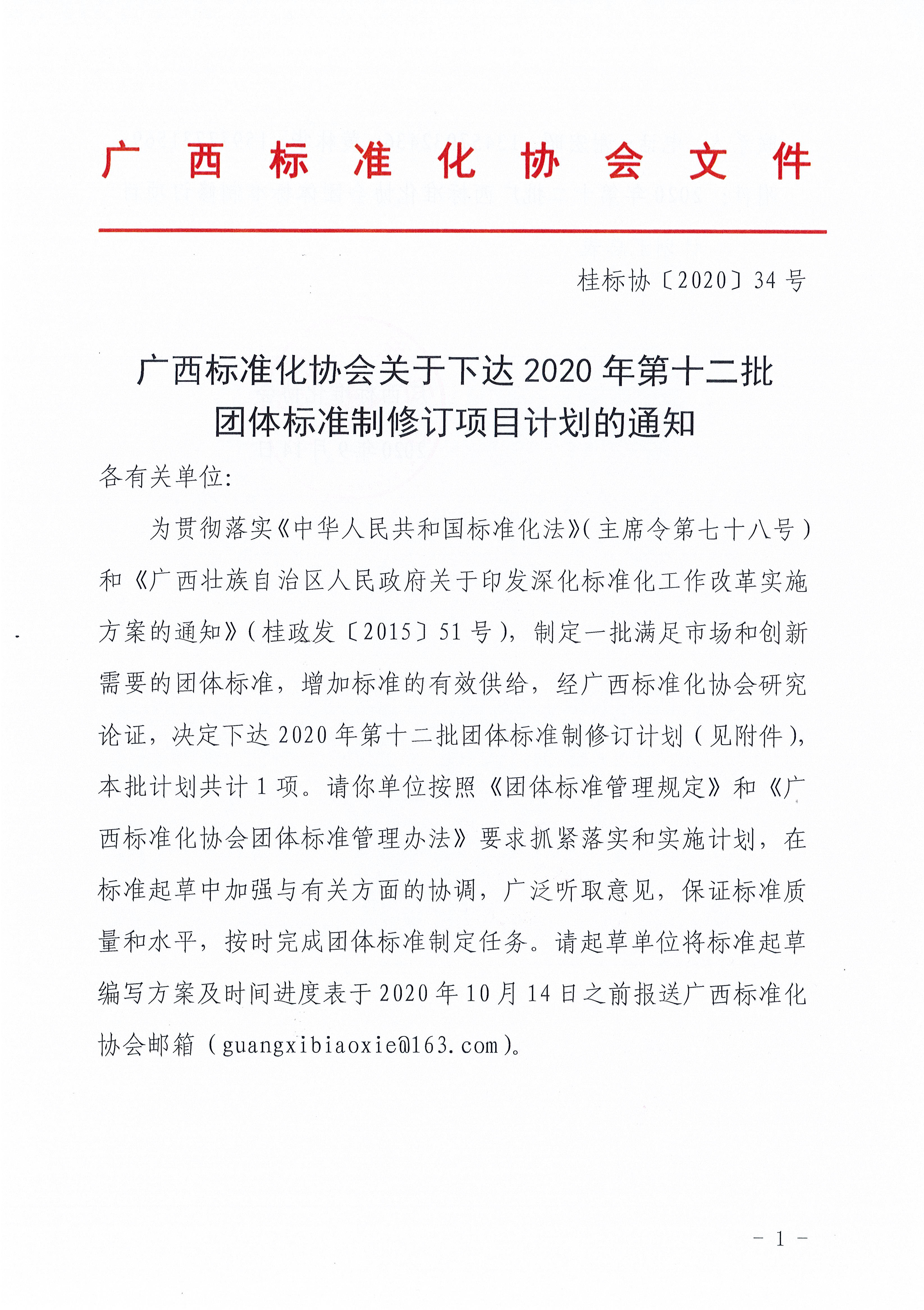 广西标准化协会关于下达2020年第十二批 团体标准制修订项目计划的通知
