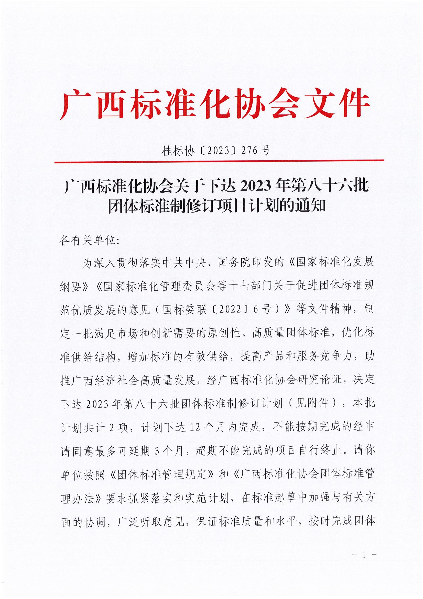 广西标准化协会关于下达2023年第八十六批团体标准制修订项目计划的通知