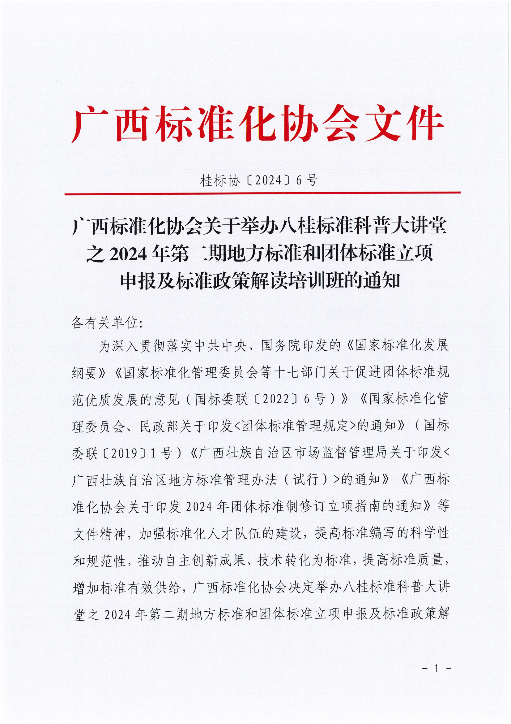 广西标准化协会关于举办2024年第一期地方标准和团体标准立项申报及标准政策解读培训班的通知