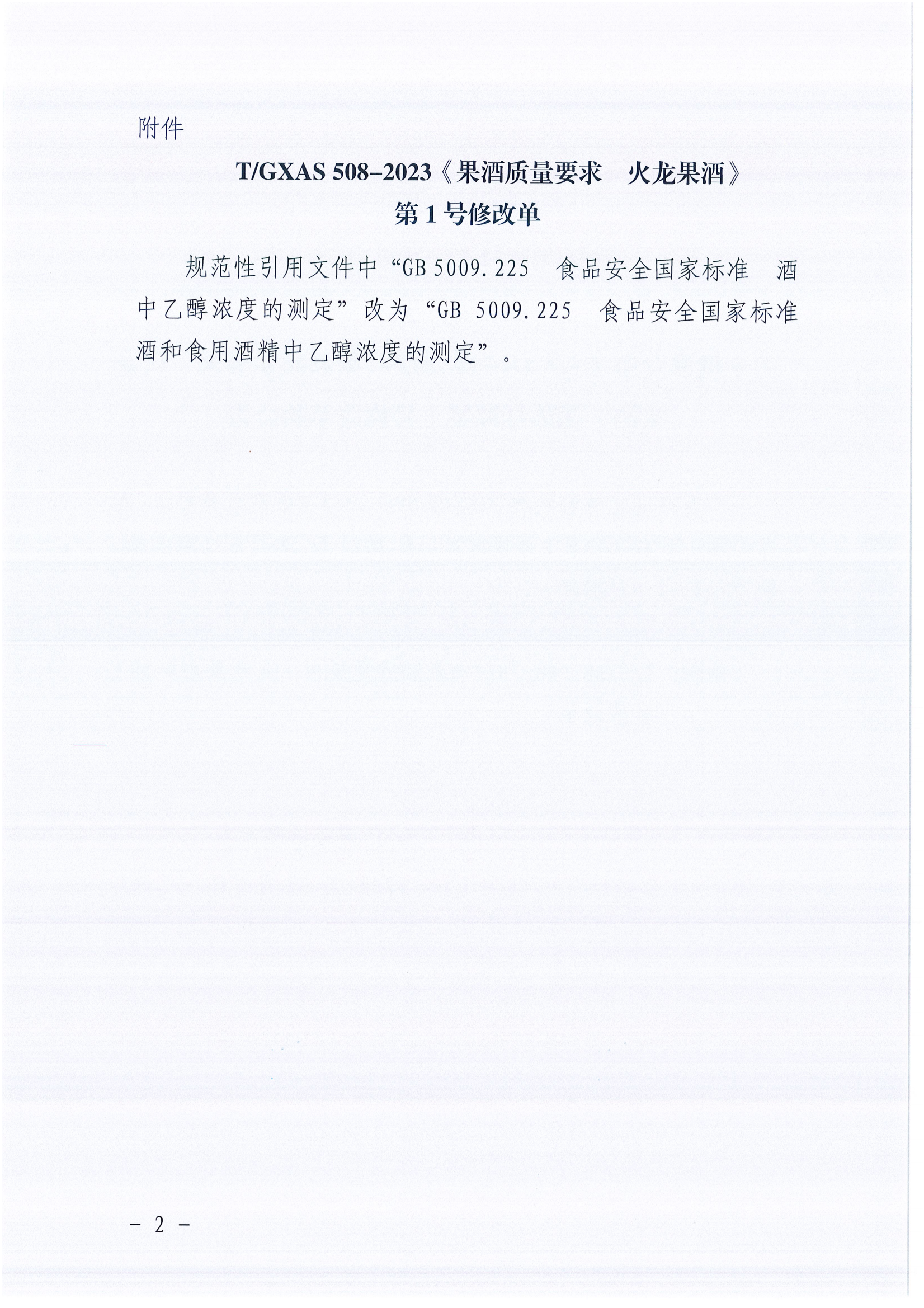 关于批准发布TGXAS 508-2023.团体标准《果酒质量要求 火龙果酒》团体标准第1号修改单的公告(2024年第57号(总第366号)