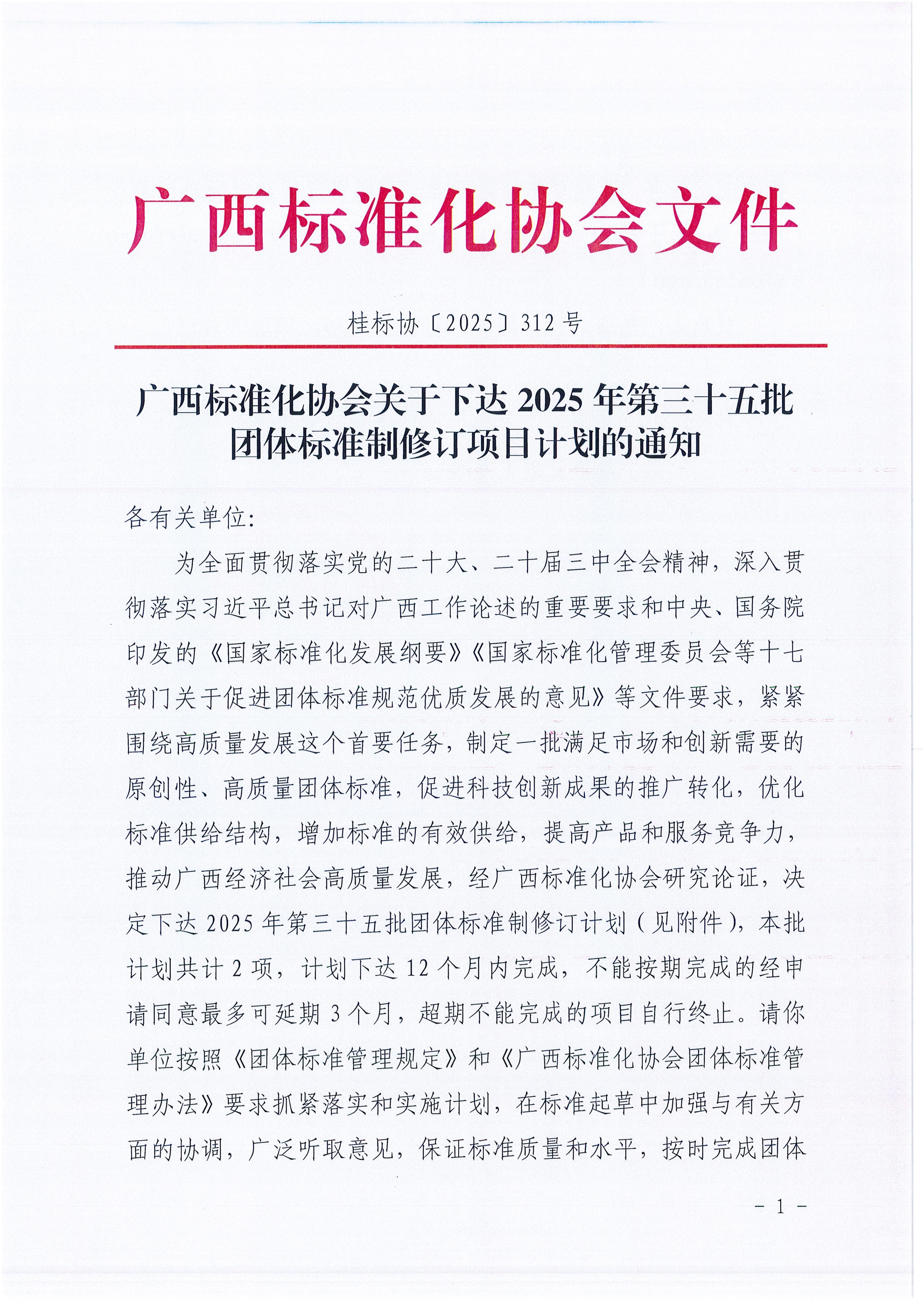 广西标准化协会关于下达2025年第三十五批团体标准制修订项目计划的通知