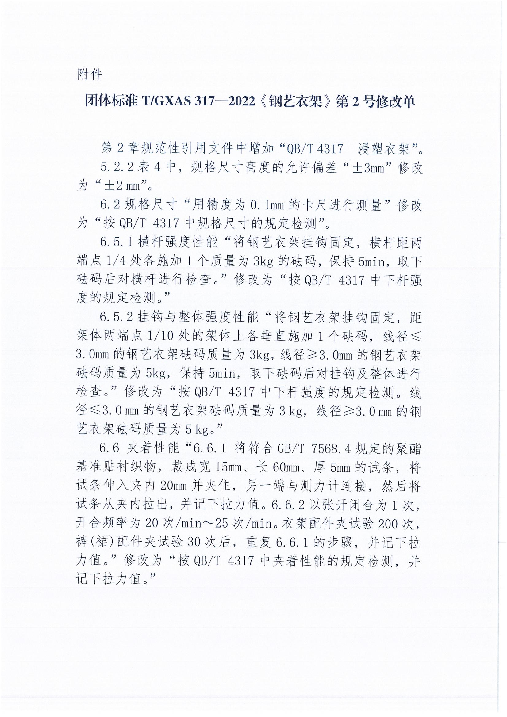 关于批准发布TGXAS 317—2022《钢艺衣架》团体标准第2号修改单的公告