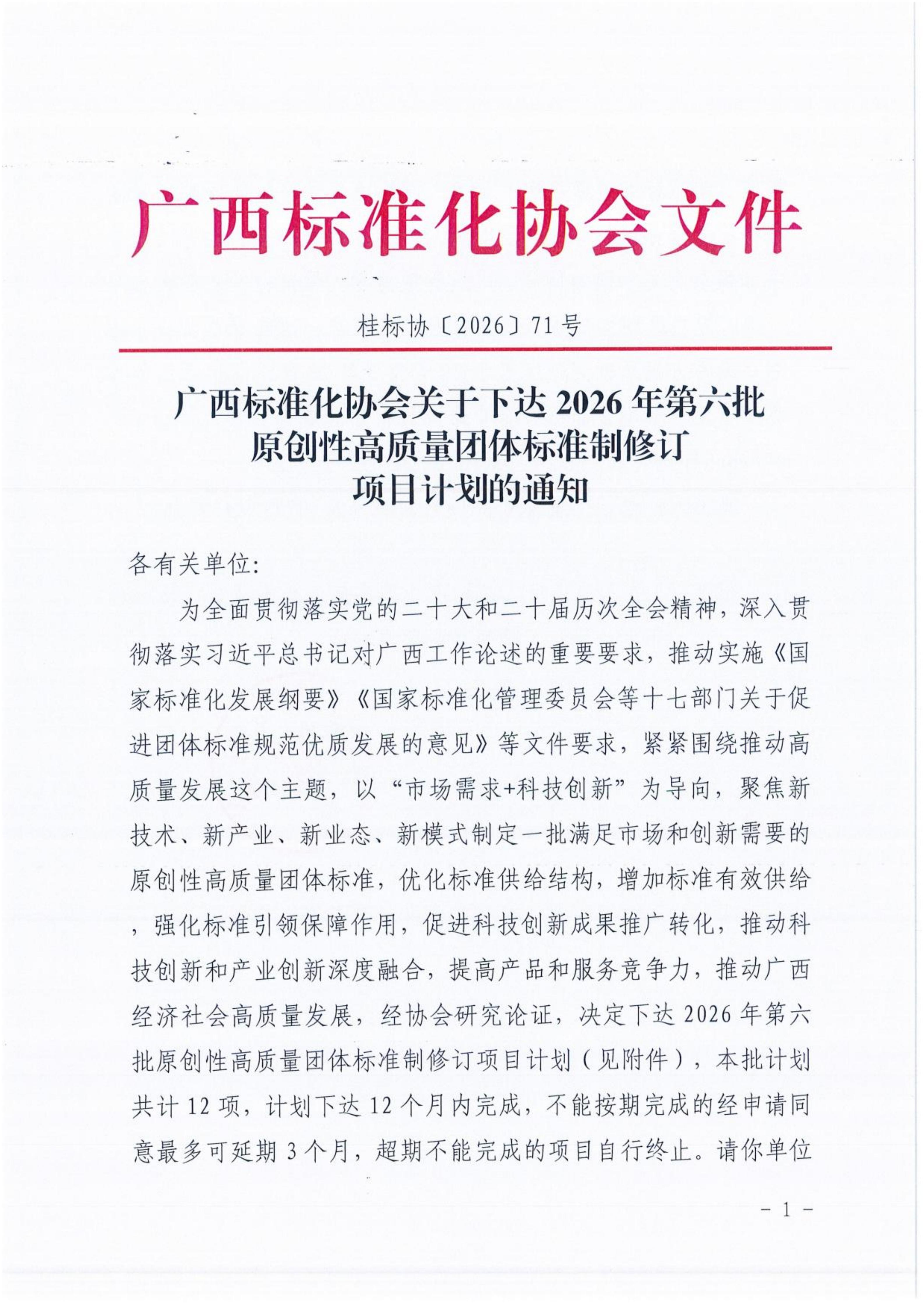 广西标准化协会关于下达2026年第六批团体标准制修订项目计划的通知