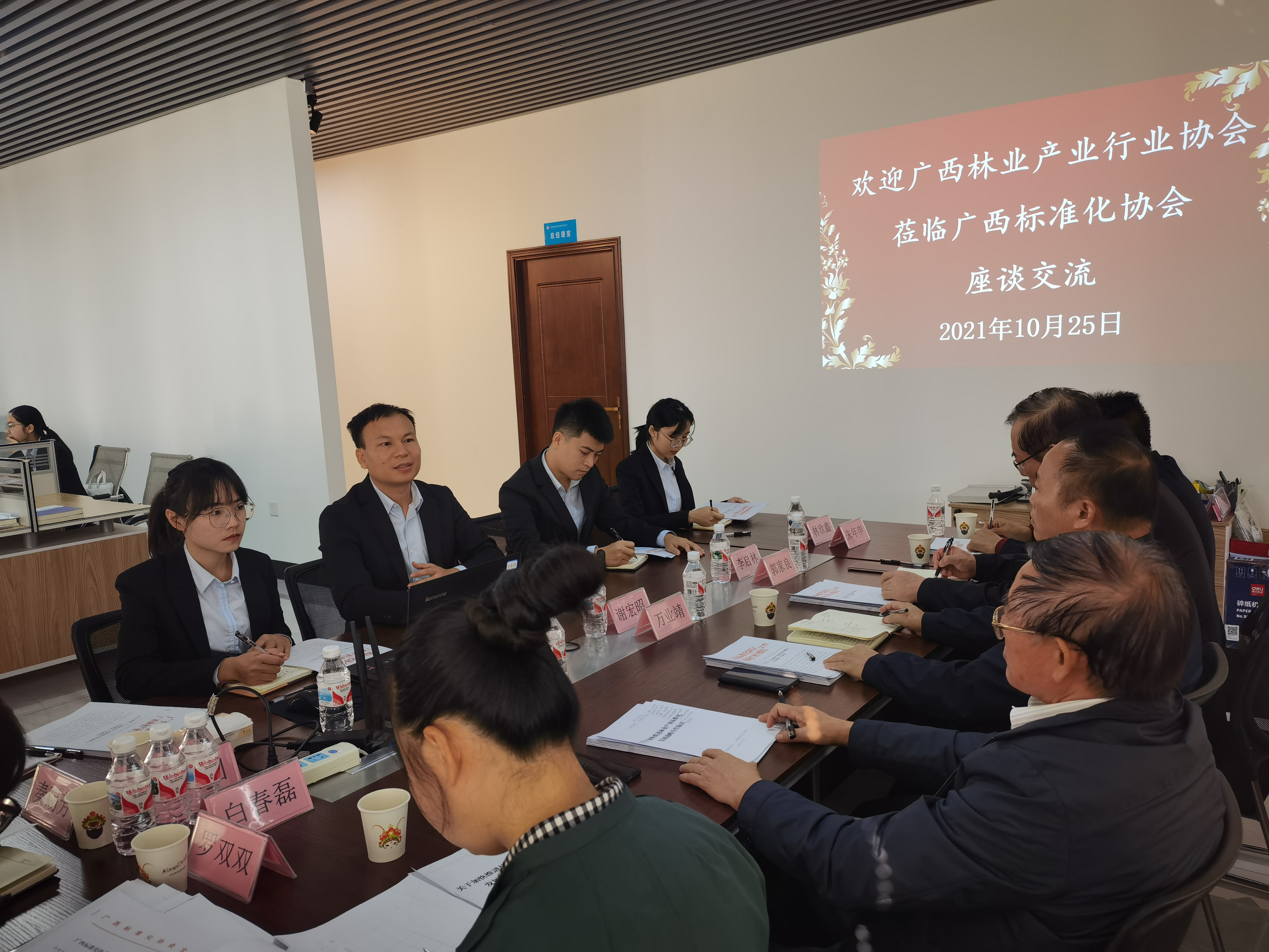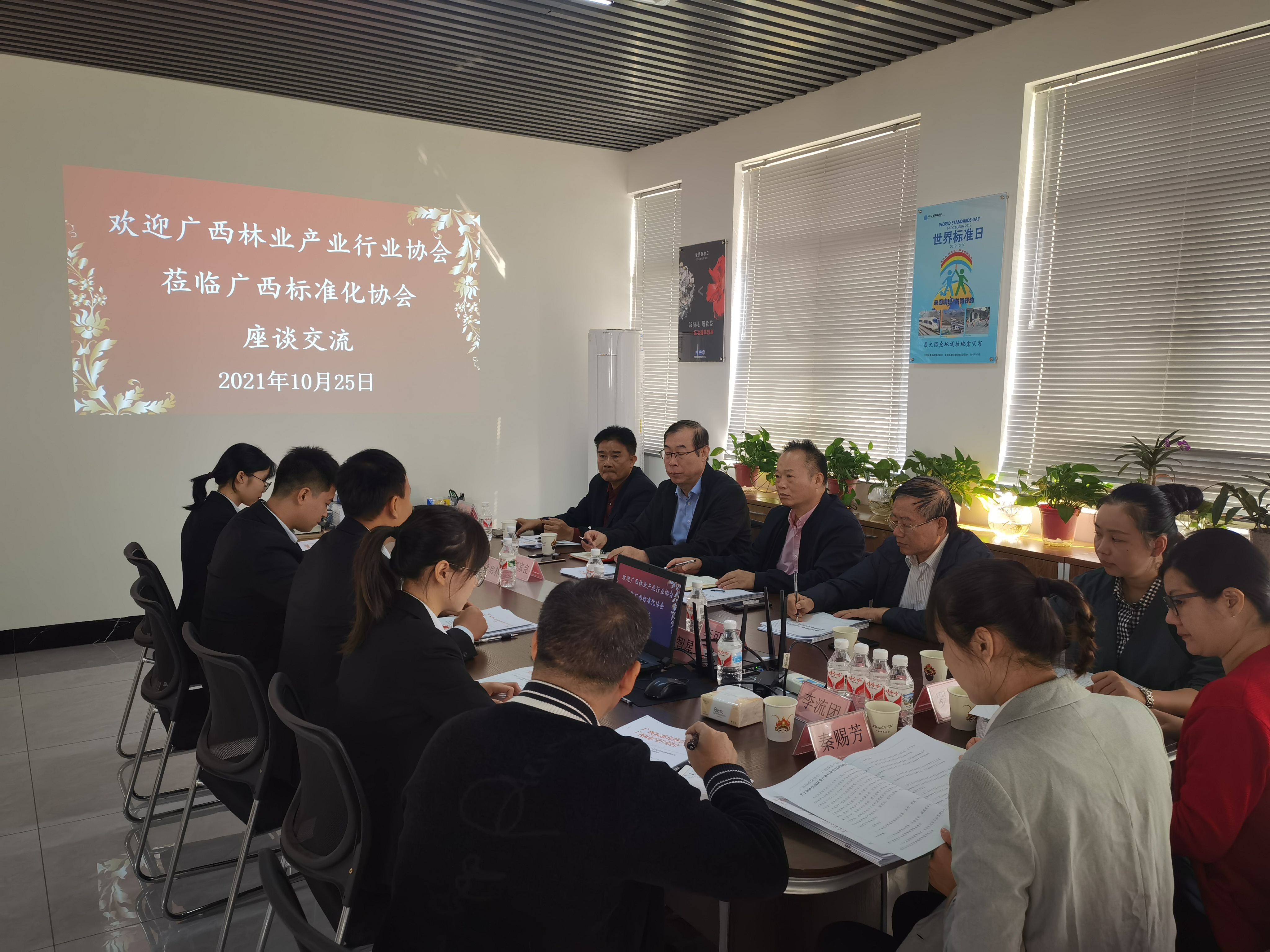 10月25日,广西林业产业行业协会莅临广西标准化协会就开展广西林业产业标准化合作进行座谈交流,广西林业产业行业协会会长万业靖、专家咨询委员会主任李可夫、秘书长郭家良、联络部长朱年申、办公室主任李流团、广西标准化协会会长谢宏昭、学会部林欣鑫、标准部李启林、综合部张智星出席座谈交流会。