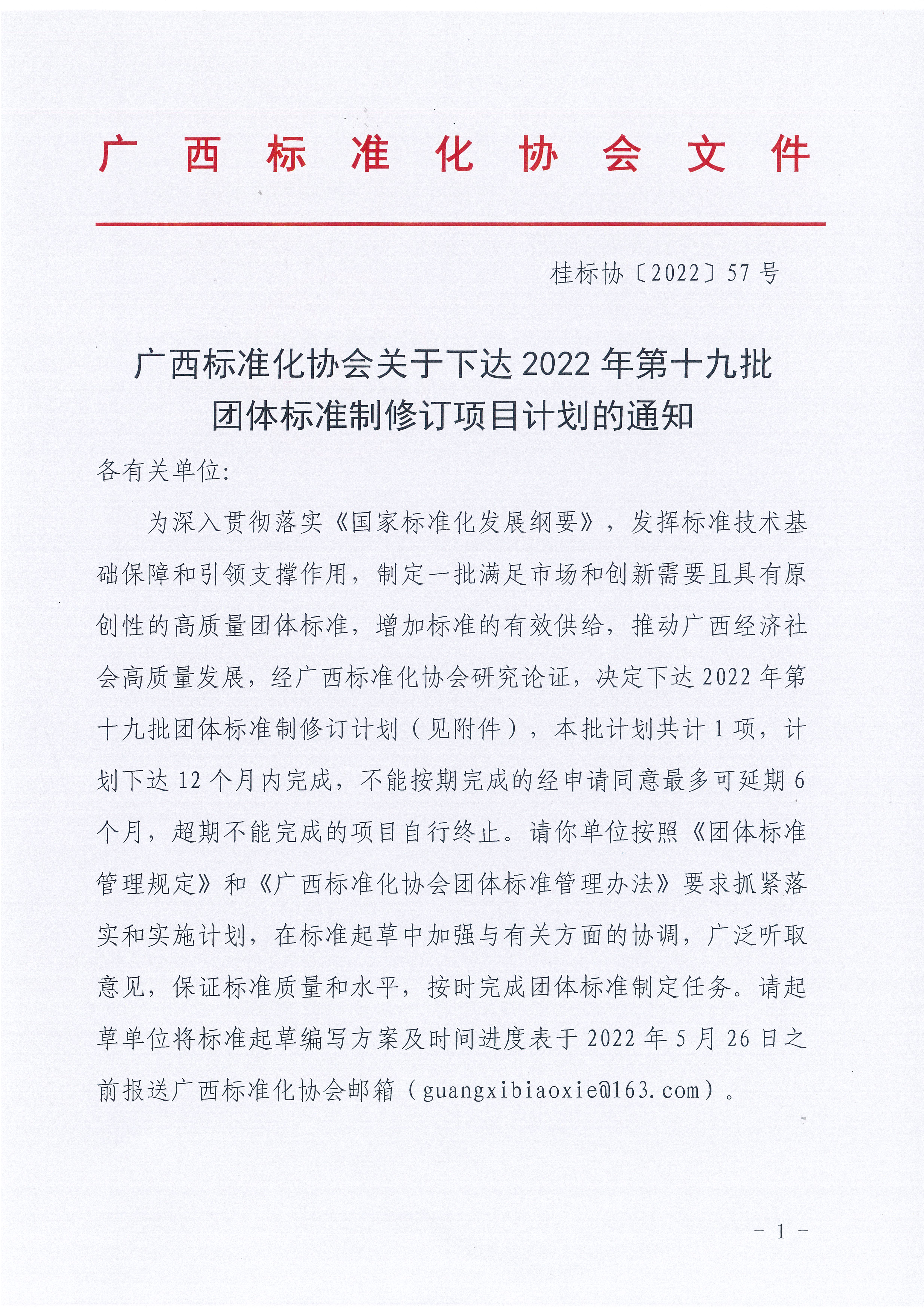 广西标准化协会关于下达2022年第十九批团体标准制修订项目计划的通知