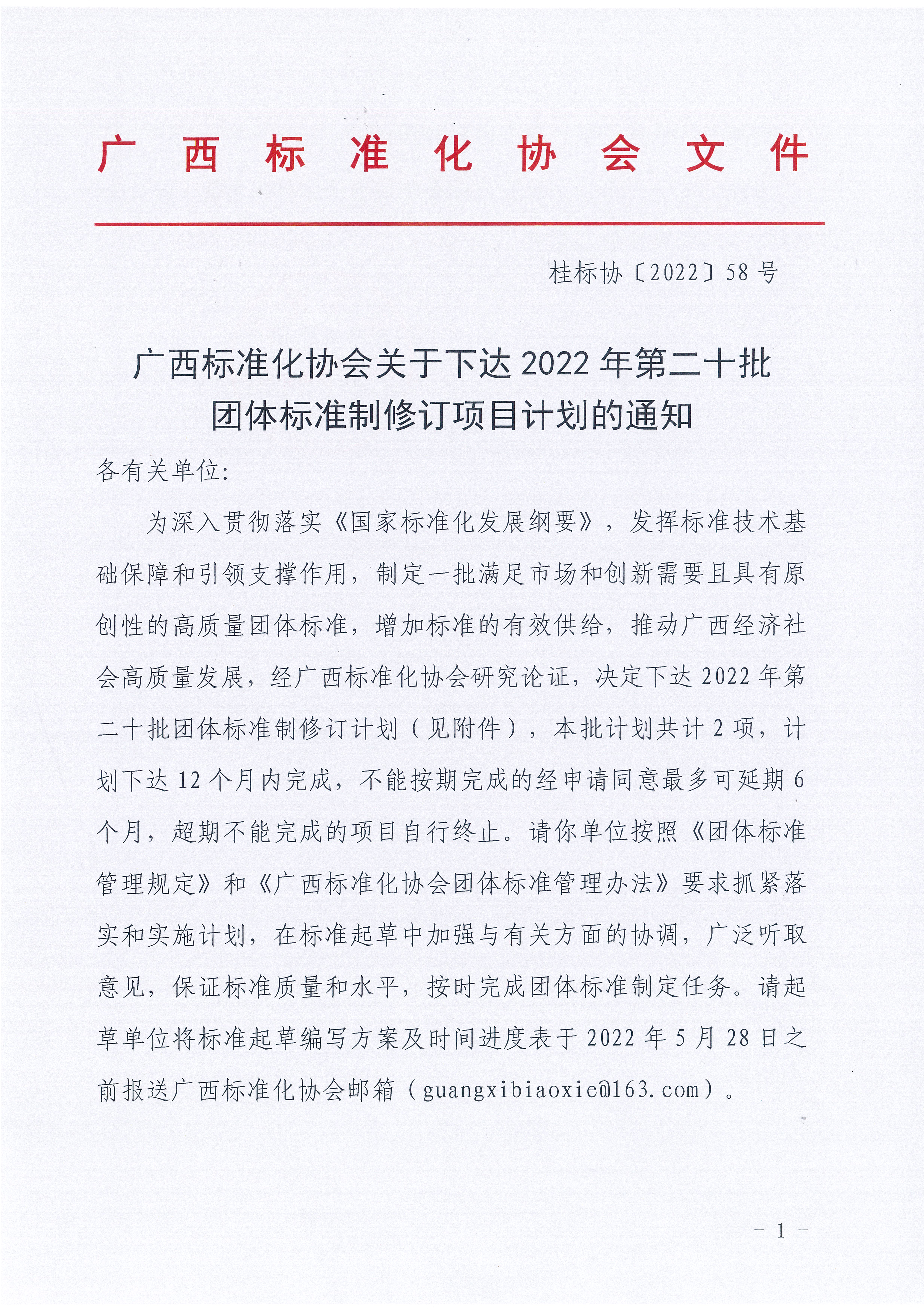 广西标准化协会关于下达2022年第二十批团体标准制修订项目计划的通知